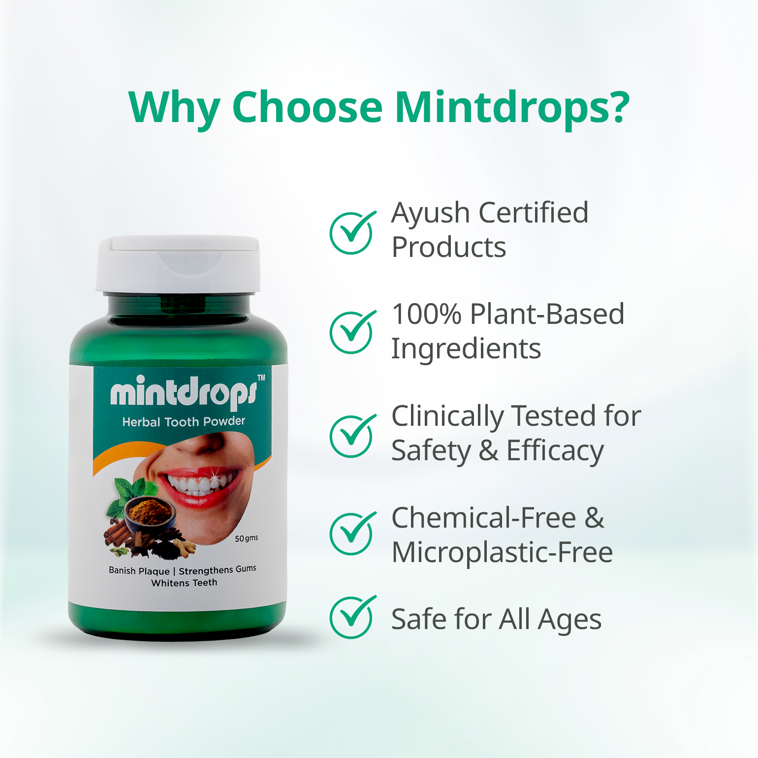 Mintdrops Herbal Tooth Powder is a plant-based oral care option crafted with a blend of herbs such as Yeshtimadhu, Tulsi, Babool, and Meswak. Inspired by traditional practices, it is formulated without SLS, fluoride, microbeads, carrageenan, parabens, or artificial preservatives. This makes it a simple addition for those looking for a natural tooth powder in their daily routine.