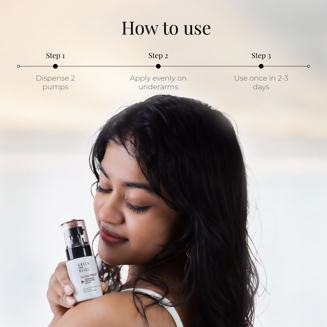 Glow Prep Underarm Exfoliating Serum is expertly formulated to exfoliate sensitive underarm skin gently, preparing it for brighter, smoother, and even-toned results. This lightweight serum is designed to remove dead skin cells and impurities without stri of pping or irritating delicate underarm skin, making it the ideal first step in your brightening regimen or for a great underarm skin.Treat your underarms with the care they deserve and experience the gentle, effective exfoliation of the Glow Prep Underarm Exfoliating Serum-the perfect prep for underarm brightening.Infused with antioxidants, this serum nourishes and protects your skin, enhancing its natural health while promoting a glowing complexion. It exfoliates gently, revealing fresher skin beneath, and boosts the absorption of your subsequent skincare treatments for enhanced efficacy.