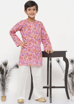 Little Bansi Boys Cotton Block Print Floral Kurta with Pearl Buttons & Pyjama in Pink & Cream - 0-3m