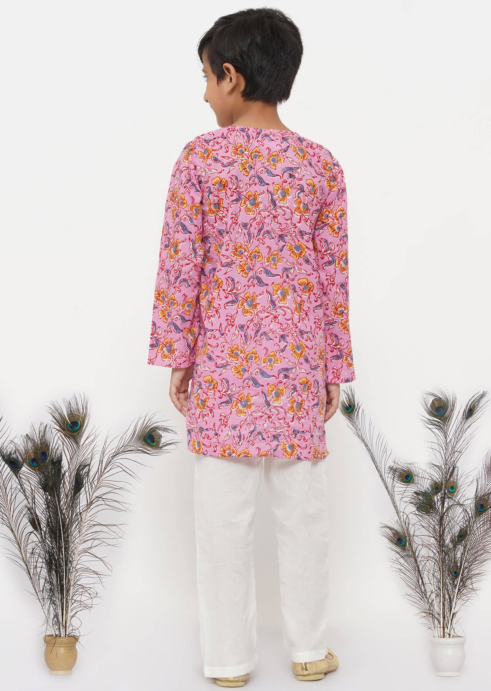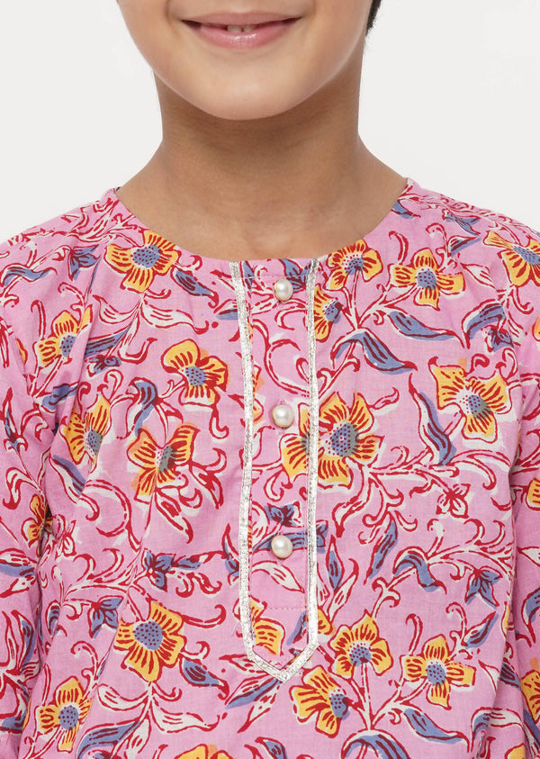 Little Bansi Cotton Block Print Floral Kurta with Pearl Buttons and Pyjama in Pink and Cream