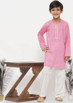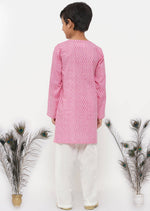 Little Bansi Boys Cotton Jaipuri Kurta with Pearl Buttons & Pyjama -Pink & Cream - 0-3m