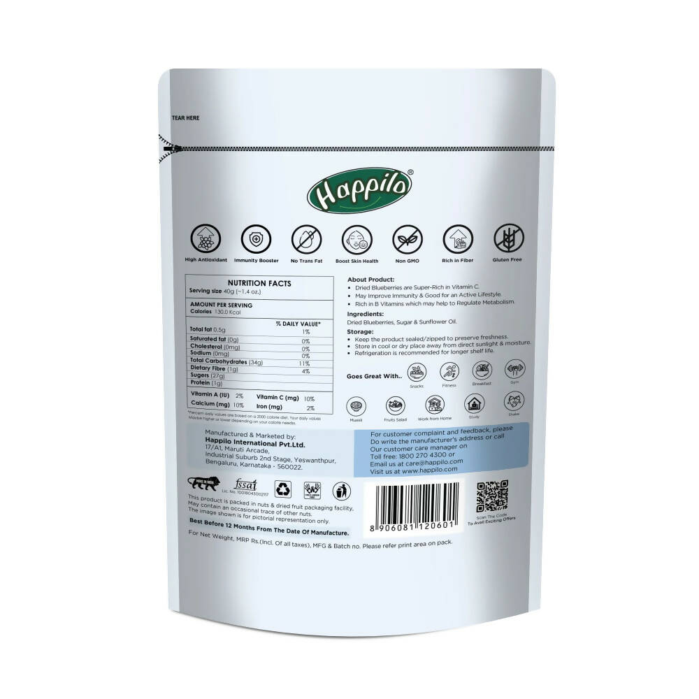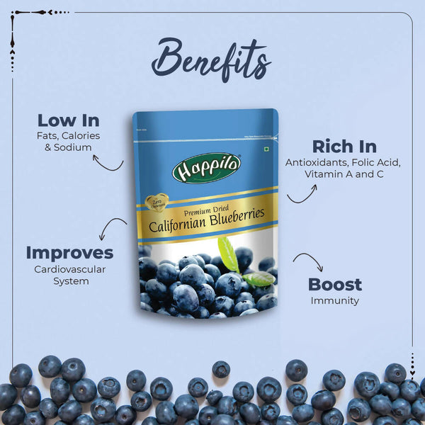 Happilo Healthy & Sweet Calfornian Dried BlueberriesAbout The Product: This delicious snack of Dried Californian Blueberries are full of fiber ...