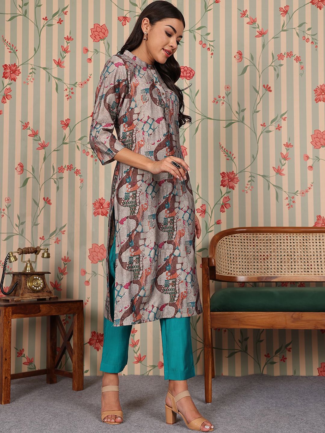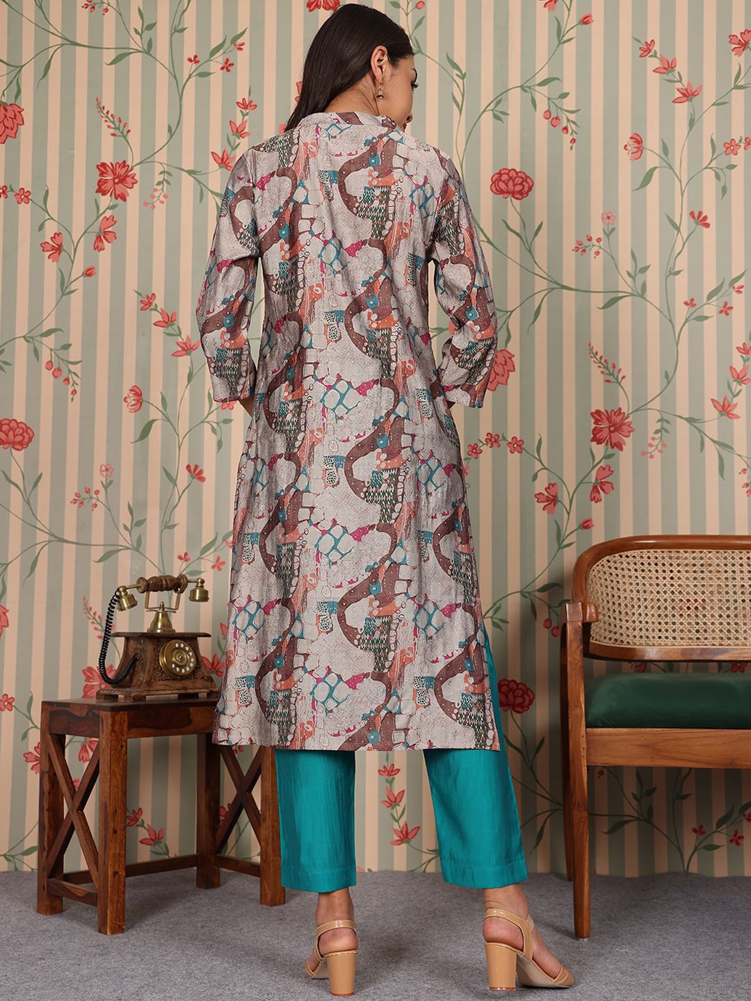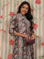Ode by House of Pataudi Mandarin Collar Printed Regular Chanderi Silk Straight Kurta Set Product Details Grey printed Kurta with Trousers Kur...