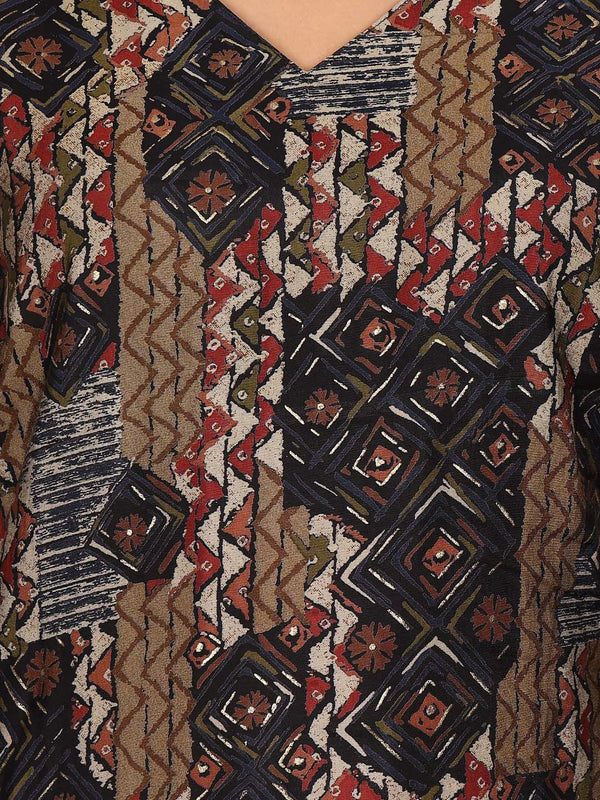 Ode by House of Pataudi V Neck Printed Regular Chanderi Silk Kurta with Trousers