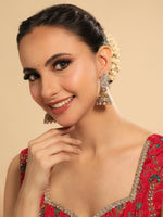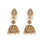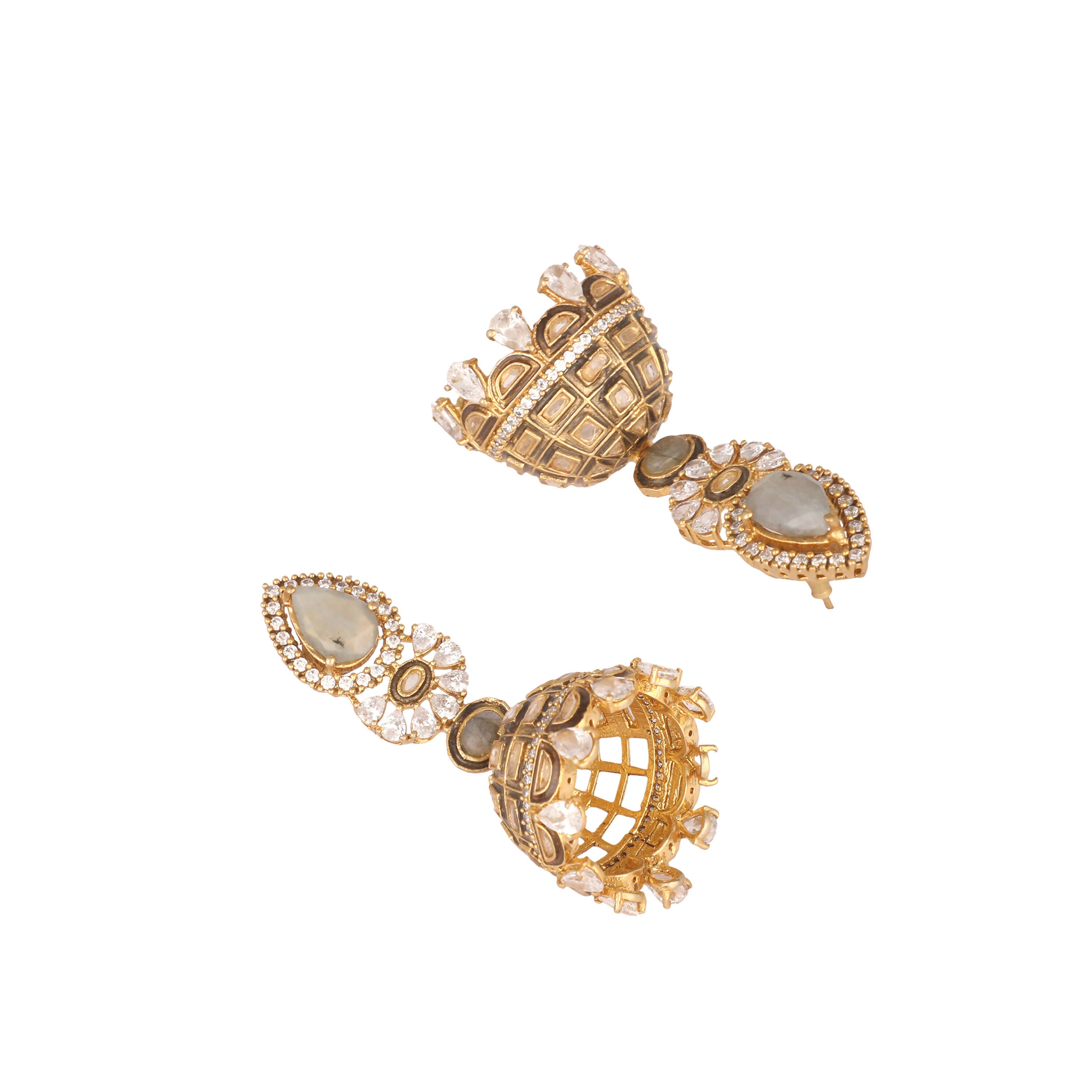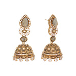 22K Gold toned, a stunning blend of antique gold finish and shimmering white stones, these jhumka earrings feature a layered design with intricate carvings and dangling pear-shaped crystals for a timeless ethnic look. Secured with push back closure. Anti-tarnish for lasting shine and comfort.