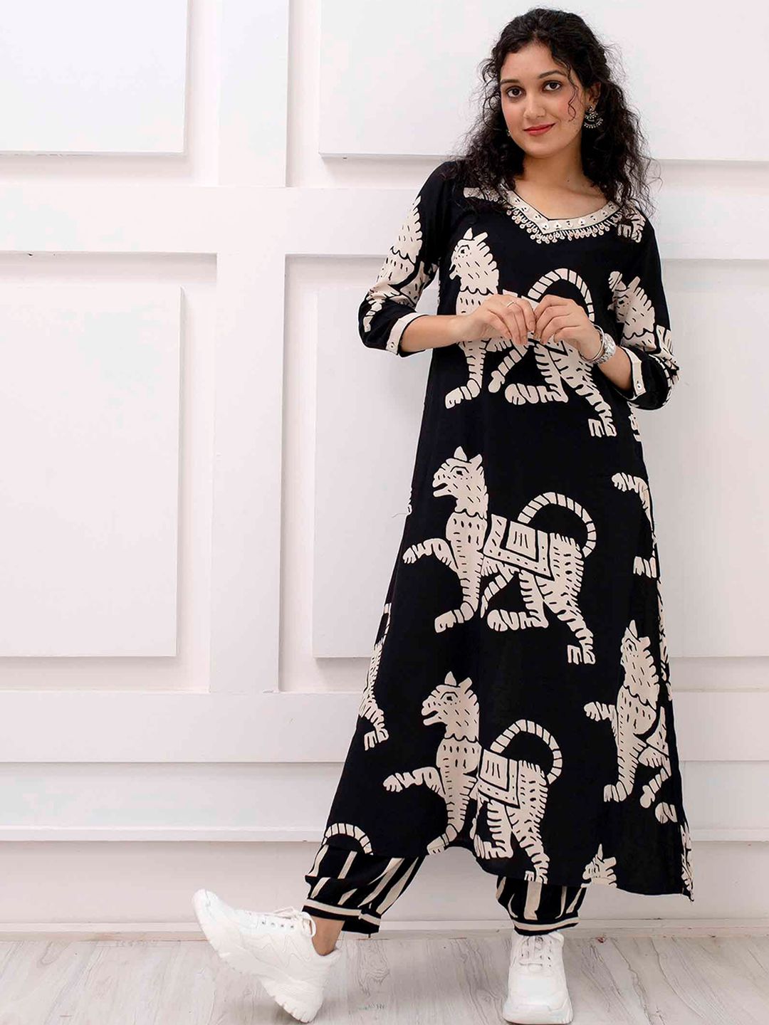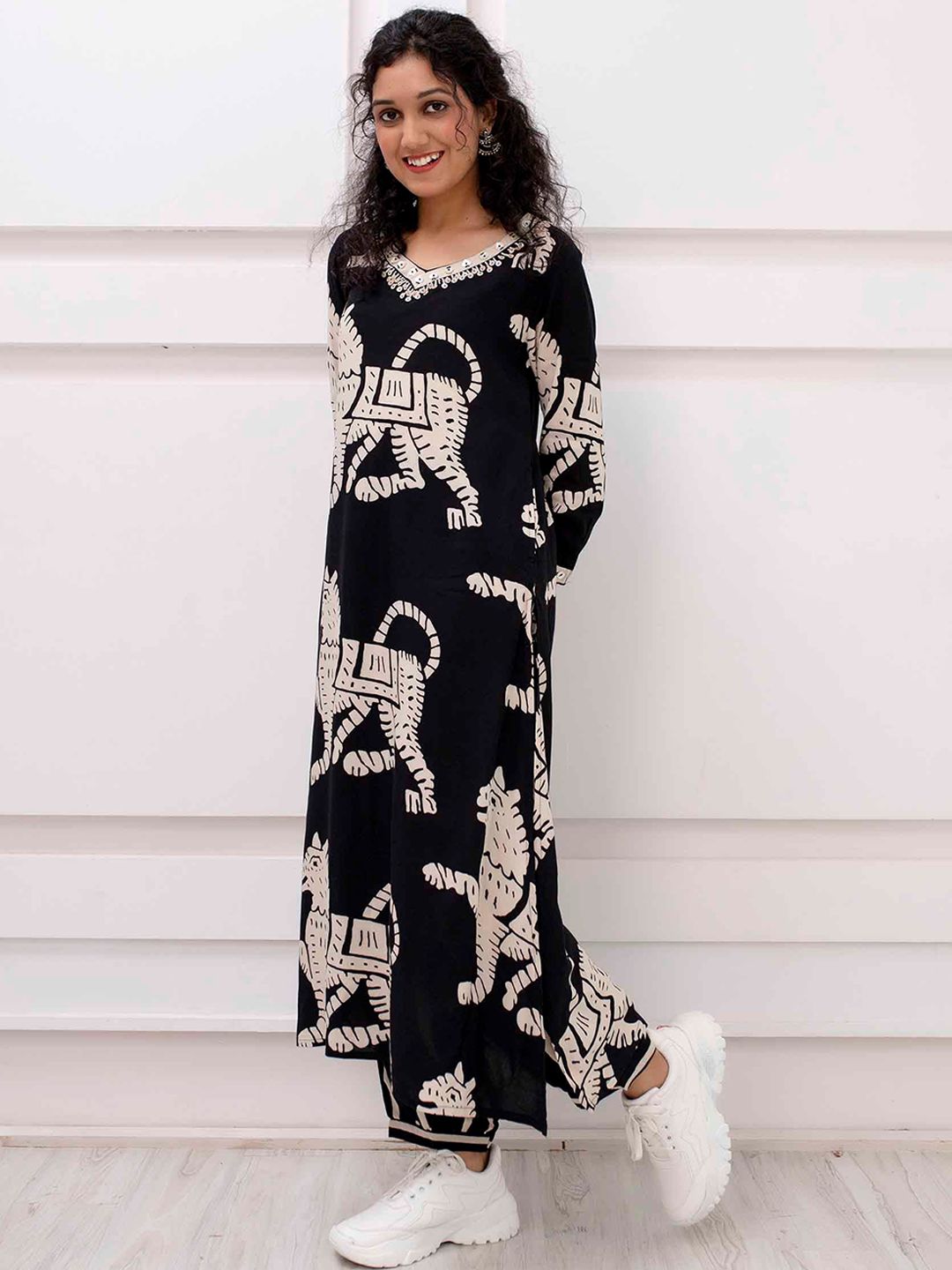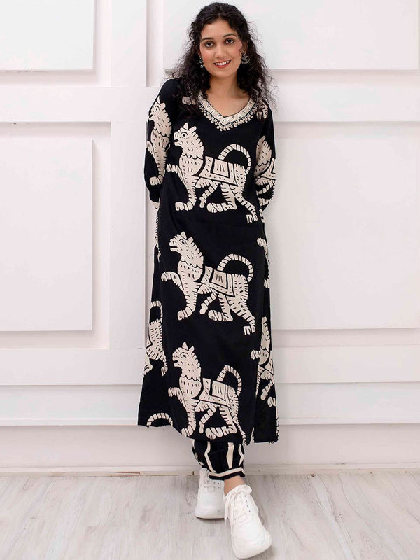 Kalini Abstract Printed V-Neck Kurta With Harem Pants Product Details Black & beige printed Kurta with Harem PantsKurta design: Abstract p...