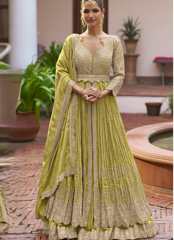 Vegaa Fashion Parrot Green Chinon Silk Embroidered & Hand Work Lehenga Style Suit