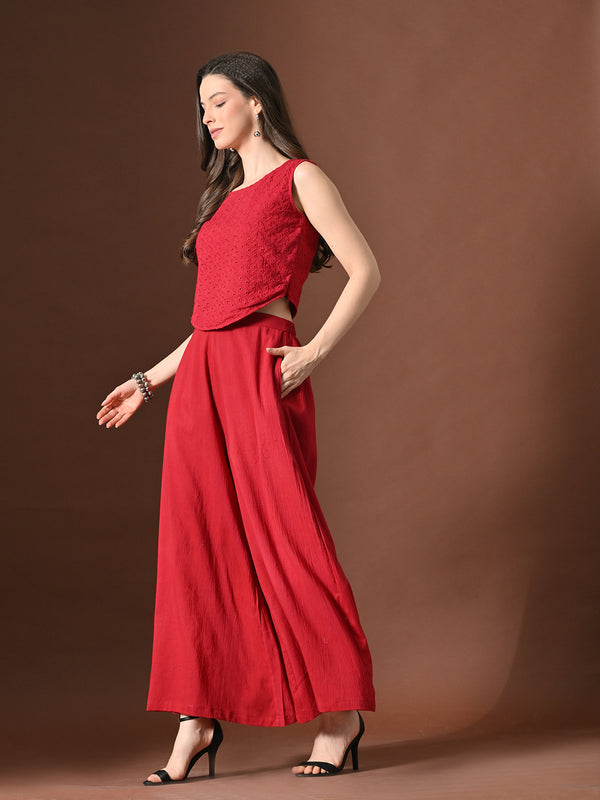 Myshka Women Red Pure Cotton Sleeveless Schiffli Top with Flared Trouser