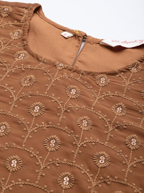 All About You Women Brown Ethnic Motifs Embroidered Chikankari Kurta with Palazzos - S