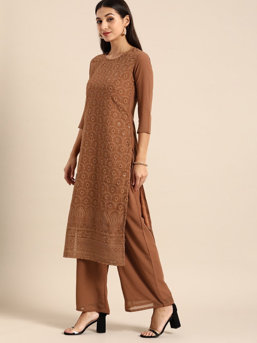 All About You Women Brown Ethnic Motifs Embroidered Chikankari Kurta with Palazzos Product Details Brown embroidered Kurta with Palazzos Kurt...