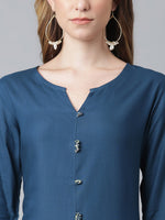 Teal blue straight calf length kurta, has a round neck, three-quarter sleeves, straight hem, multiple slits