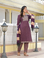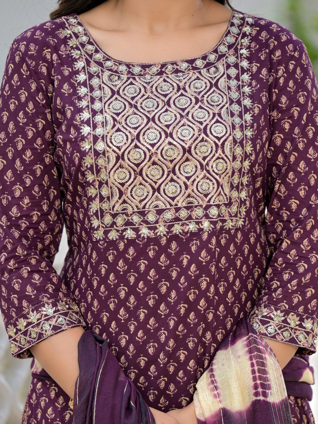 Juniper Women's Wine Ethnic Motif Printed Cotton Kurta, Pant And Dupatta Set With Zari Work & Sequins