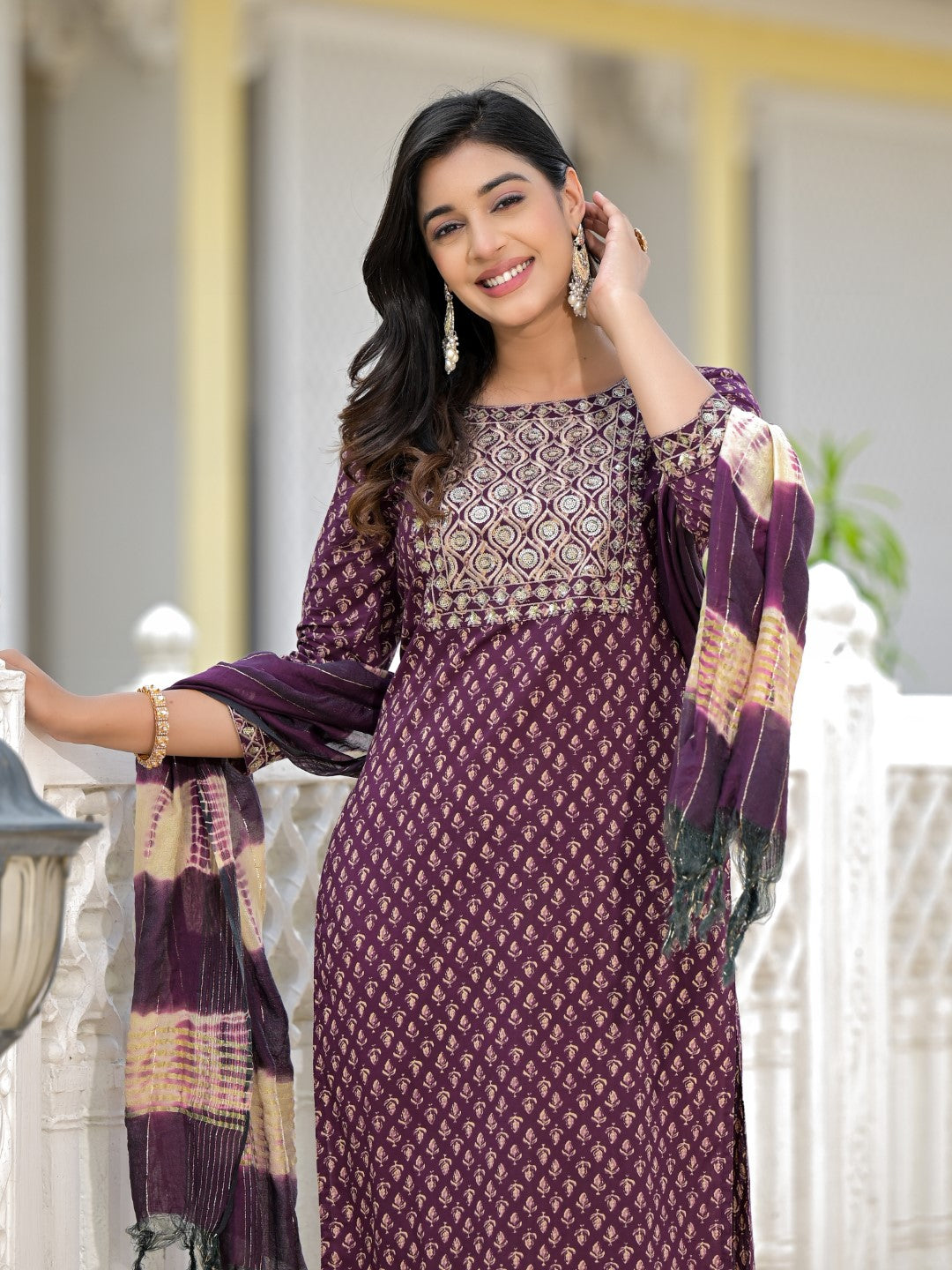 Juniper Women's Wine Ethnic Motif Printed Cotton Kurta, Pant And Dupatta Set With Zari Work & Sequins - Distacart