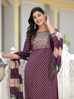 Juniper Women's Wine Ethnic Motif Printed Cotton Kurta, Pant And Dupatta Set With Zari Work & Sequins - XL