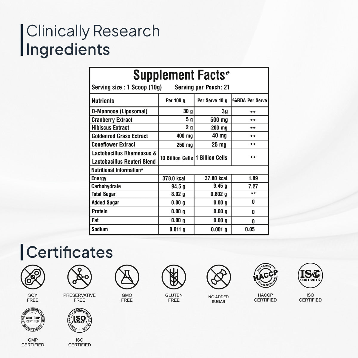 • Cranberry Extract, D-mannose, Hibiscus Extract, Goldenrod Grass Extract, and Coneflower Extract contain no animal product
