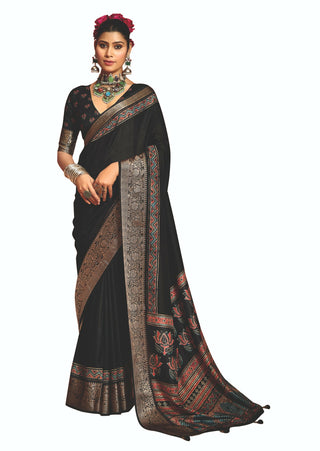 Monjolika Fashion Black Silk Blend Print Work Traditional Saree for Ceremonial