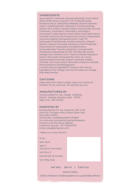 • 5% White Nectar from Snow Mushroom, Rice Water, and Oatmeal Extracts provides deep, lasting hydration. The 7% Ceramide + Natural Moisturizing Factors Complex strengthens the skin’s barrier, ensuring moisture retention. Beta Glucan adds an extra layer of nourishment and soothing benefits.