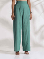 • Elevate your style with this cotton printed double breasted jacket complemented by solid green flared pants, it's an ideal blend of elegance and comfort.