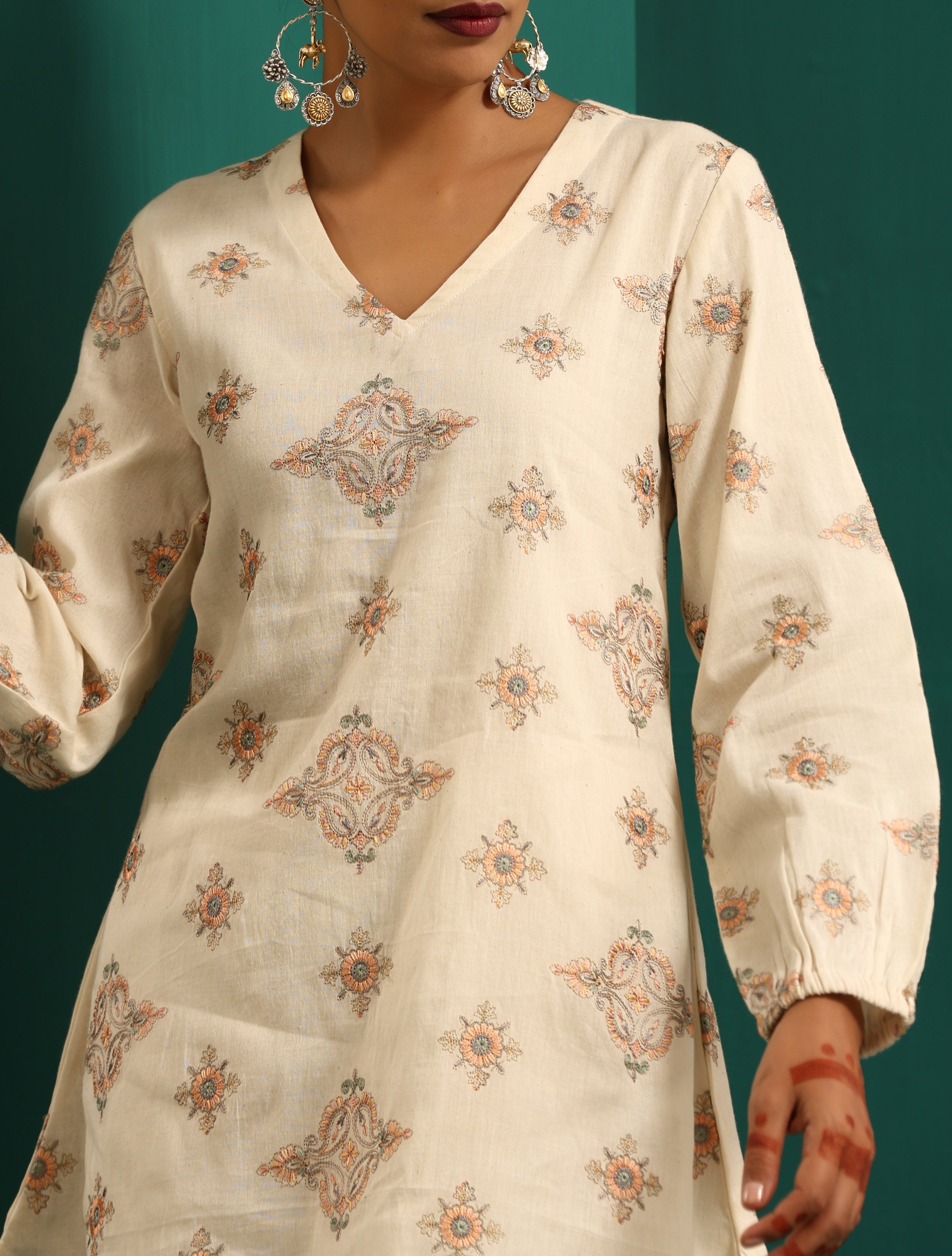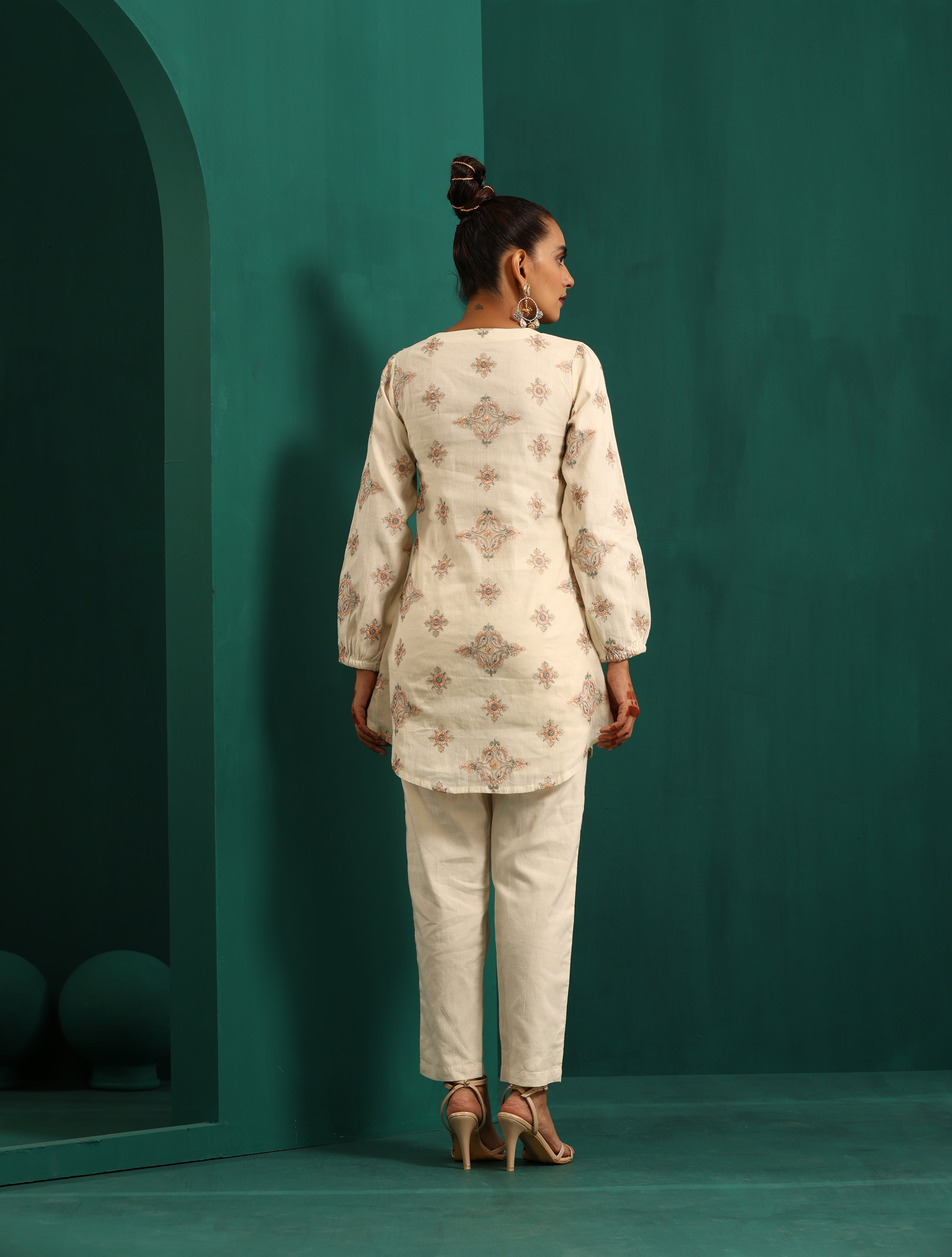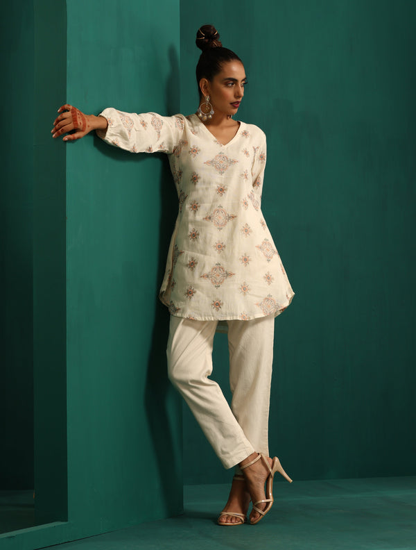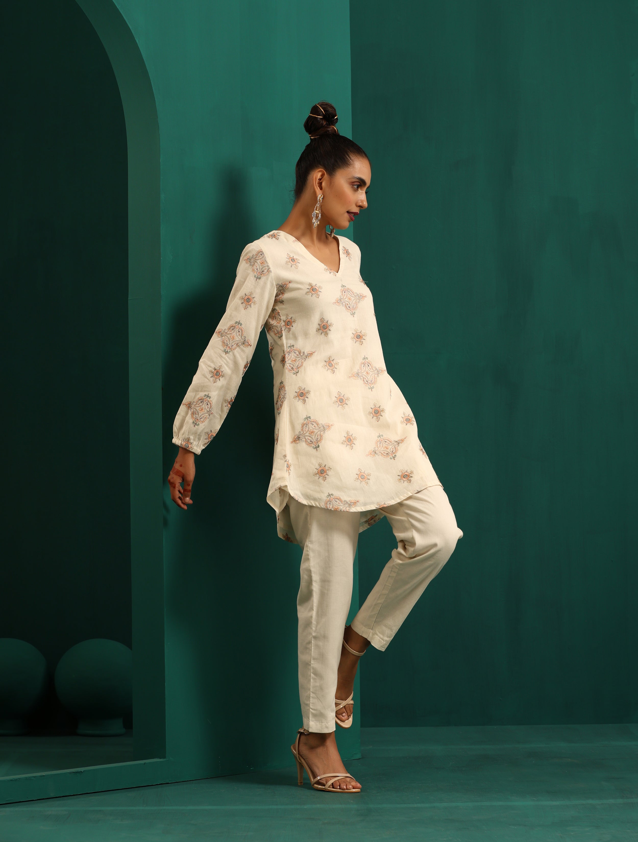 • Cotton embroidered Co-ord Set with V neckline and gathered sleeves. Paired with elasticated waist pant.