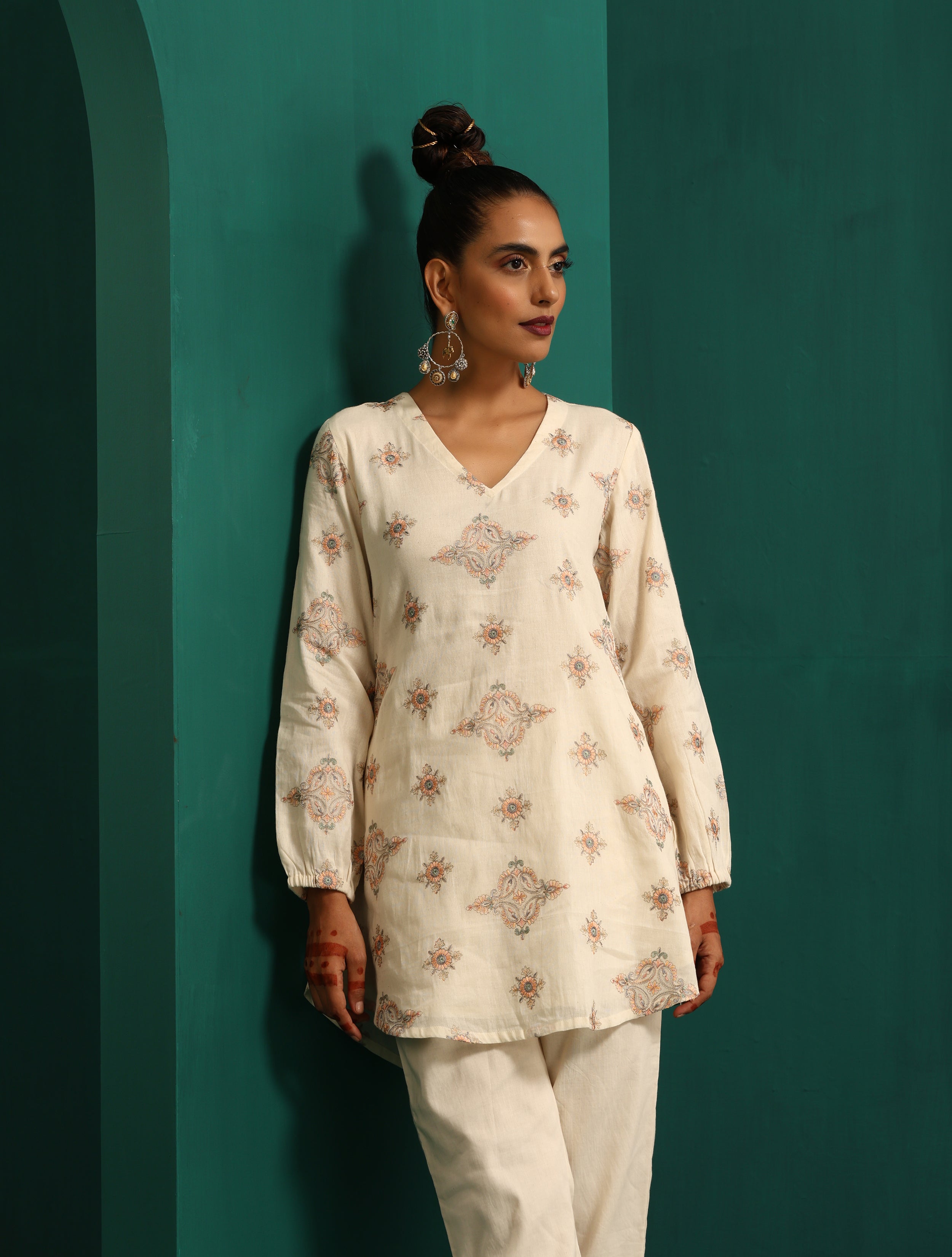 trueBrowns Ivory Peach Cotton V-Neck Co-Ord Set