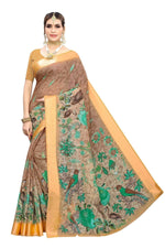 Vamika Orange and Green Linen Digital Print with Satin Border Floral Saree