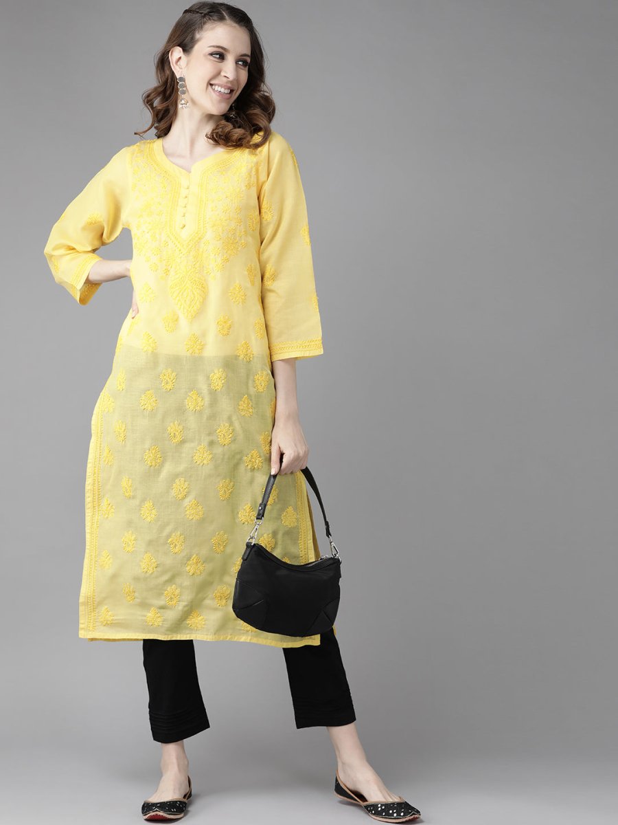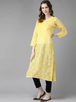 Yellow Chikankari embroidered straight calf length kurta, has a notched round neck, button detail, three-quarter sleeves, straight hem, side slits