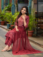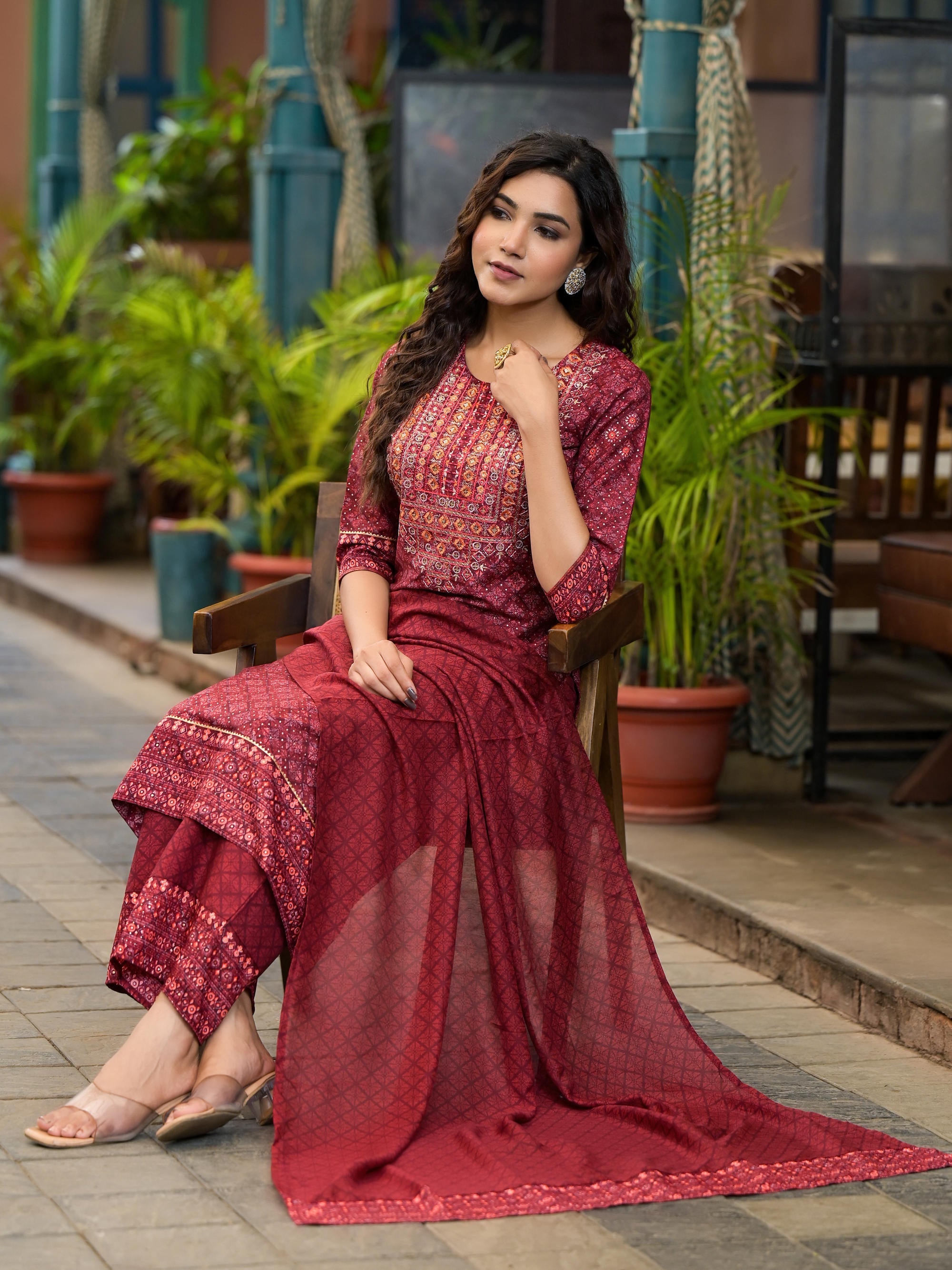 Rust ethnic motif printed cotton kurta set, adorned with intricate thread work, Zari detailing, and sequins. The Calf-length, straight kurta features a classic round neck and three-quarter sleeves, paired with printed slip-on pants and a coorditing printed dupatta for a refined, elegant look.