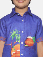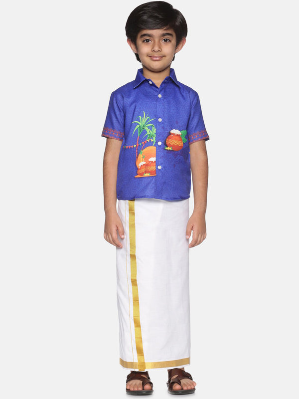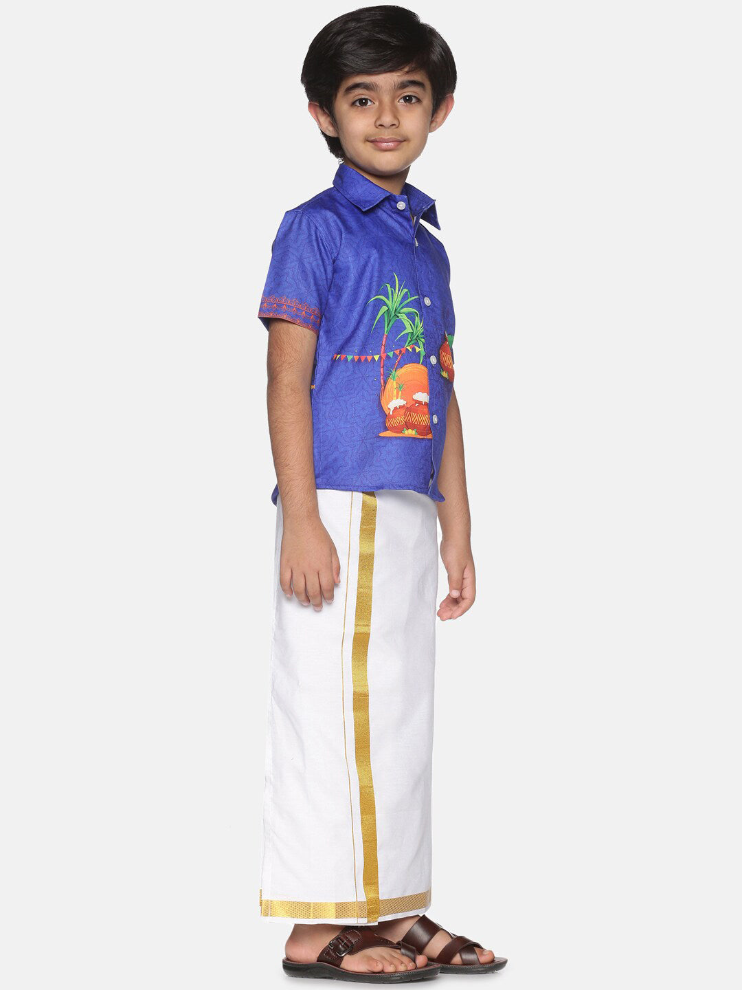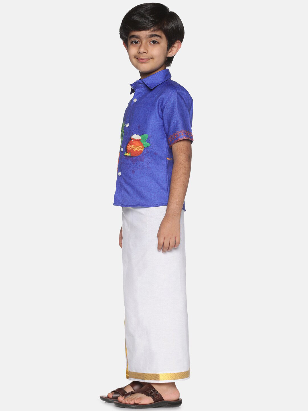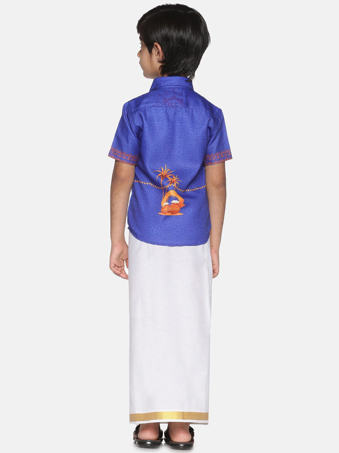 Sethukrishna Boys Blue & White Printed Shirt With Pure Cotton Dhoti Set