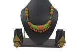 Terracotta Light Green and Gold Tribal Theme Necklace Set with Ear Hangings