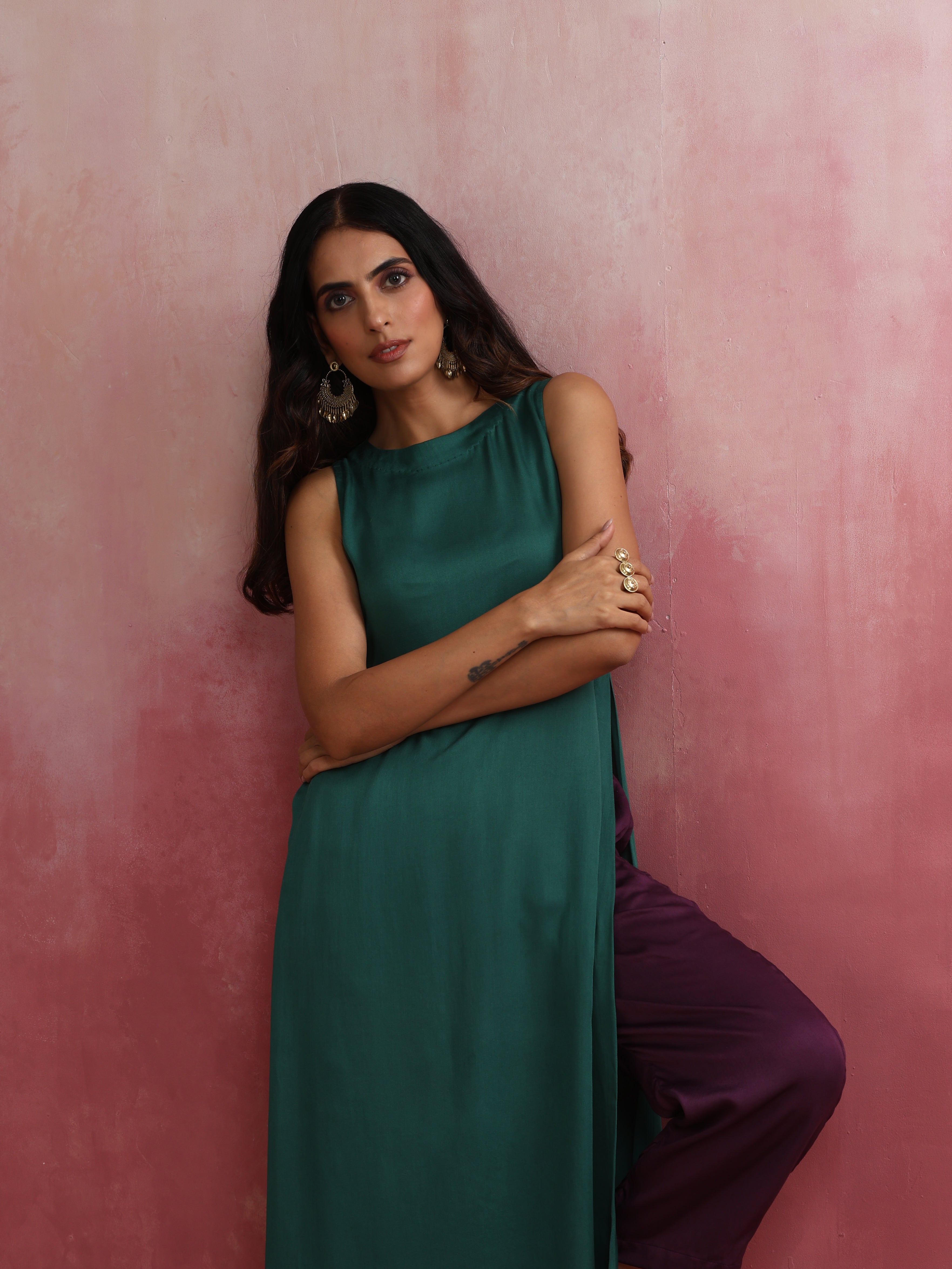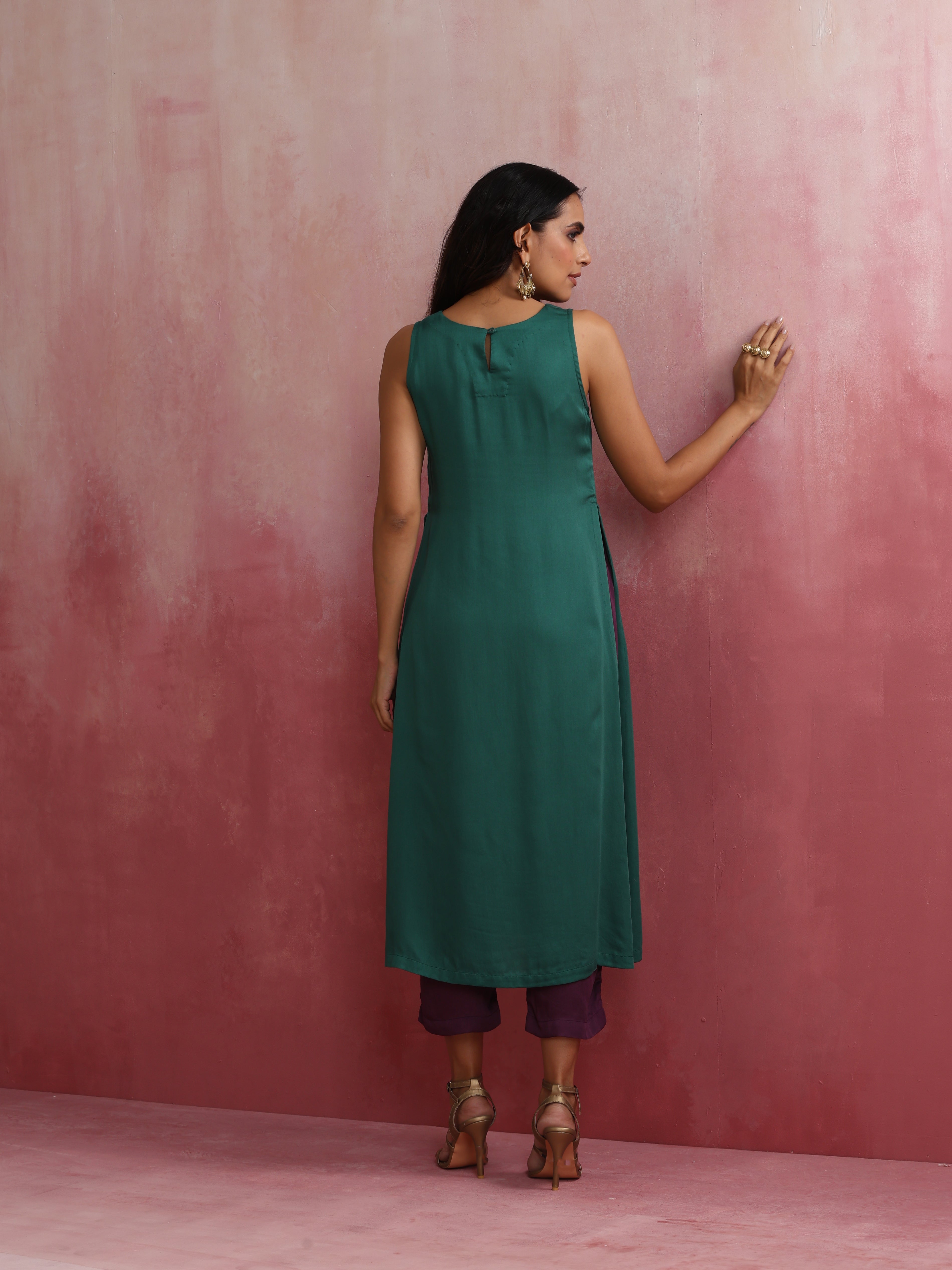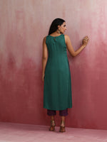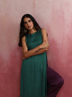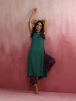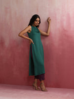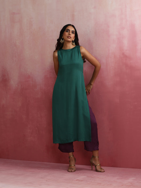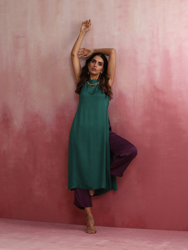 trueBrowns Green Modal High slit Kurta SetDescription Elevate your style with this green modal solid high slit kurta with boat neck and back openin...