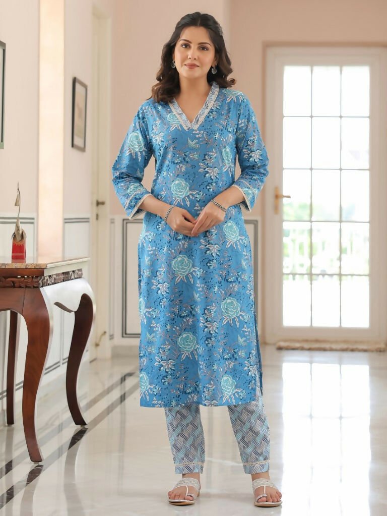 Aramya Straight Soft Cotton Floral Print Women's Kurta Set - Blue
