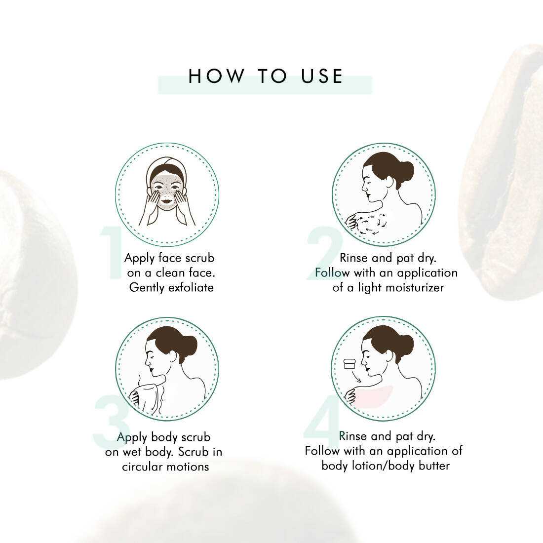 • The Exfoliation & Tan Removal kit offers complete exfoliation for the face and body. Coffee Body Scrub exfoliates to get rid of dead skin from the entire body including troublesome areas such as the neck, elbows, underarms, knees and feet. Coffee Face Scrub provides gentle exfoliation for the facial skin.