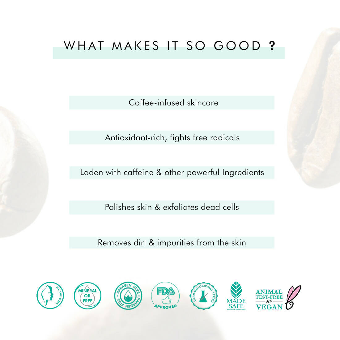 • Caffeine-infused duo brewed for exfoliation and tan removal! Loaded with Pure Arabica Coffee, the Exfoliation & Tan Removal Kit has Coffee Face Scrub and Coffee Body Scrub. This kit exfoliates, removes tan, blackheads and dead skin to leave your skin fresh and smooth. It also exudes the irresistible aroma of freshly brewed coffee.