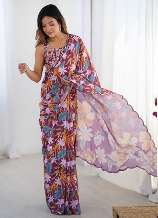 Vegaa Fashion Wine Chinon Silk Print Work With Mirror Work Border Designer Saree