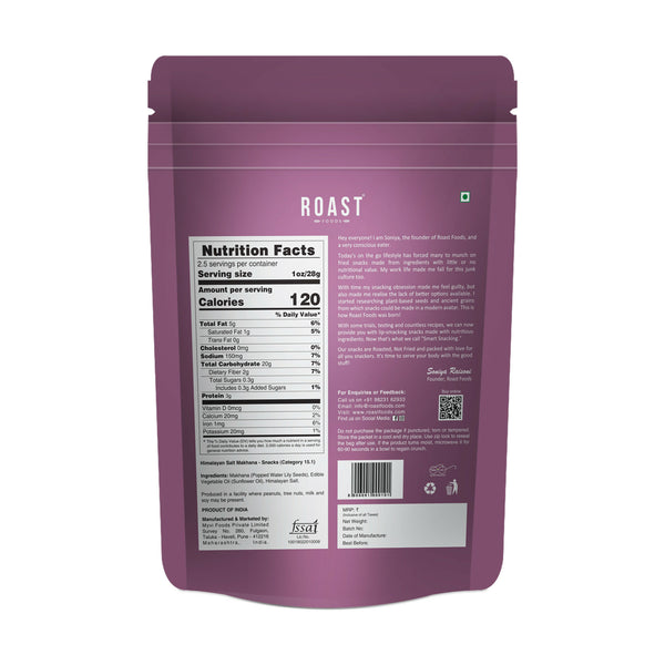 Roast Foods Makhana Himalayan Salt     About the Product:Roasted Makahana Sprinkled with Himalayan Salt Seasoning Legal Disclaimer: Product images ...
