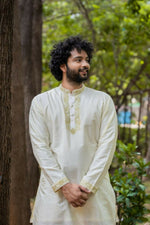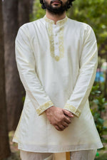 Featuring a machine-embroidered pattu set, for grooms. It's a gold zari-based embroidery on the collar neckline and cuffs. its a set along with a single zari bordered elastic dhoti with gold plain zari borders Kaduva.