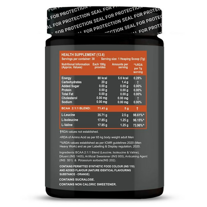 Carbamide Forte BCAA Powder With 2:1:1 Ideal Ratio - Orange Flavour - 210 gm
