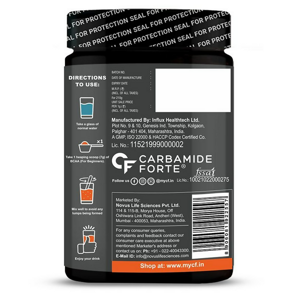 Carbamide Forte BCAA Powder With 2:1:1 Ideal Ratio - Orange FlavourIngredients:BCAA, L-Glutamine. How to use: Take a glass of normal water. Take 1 ...