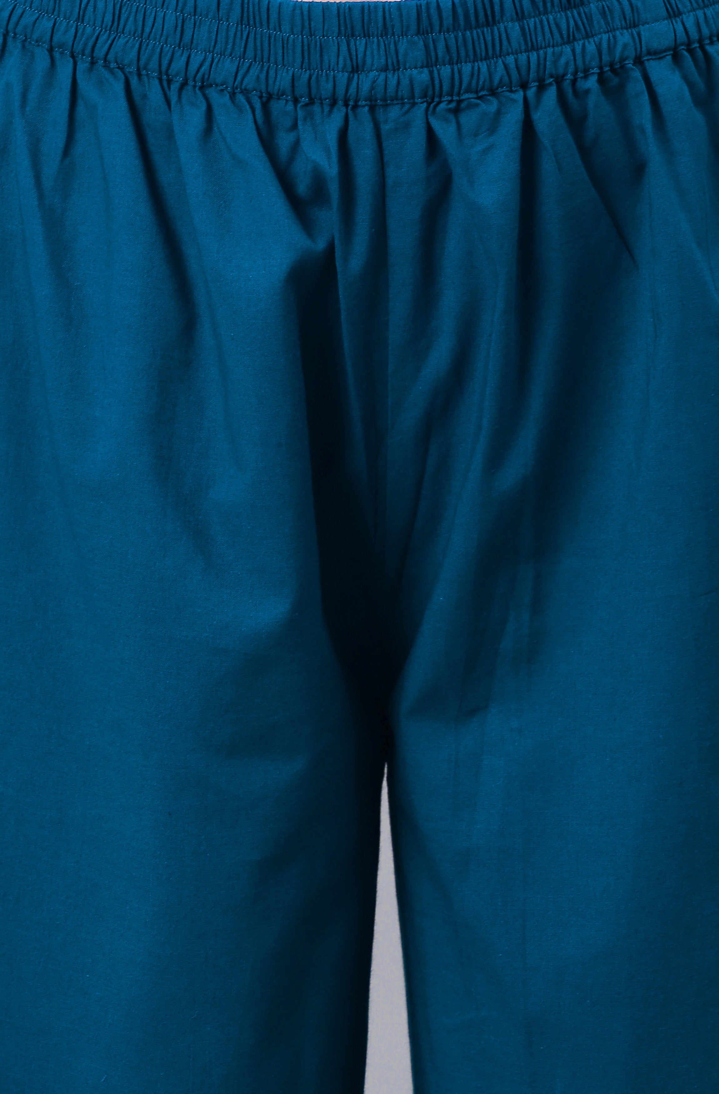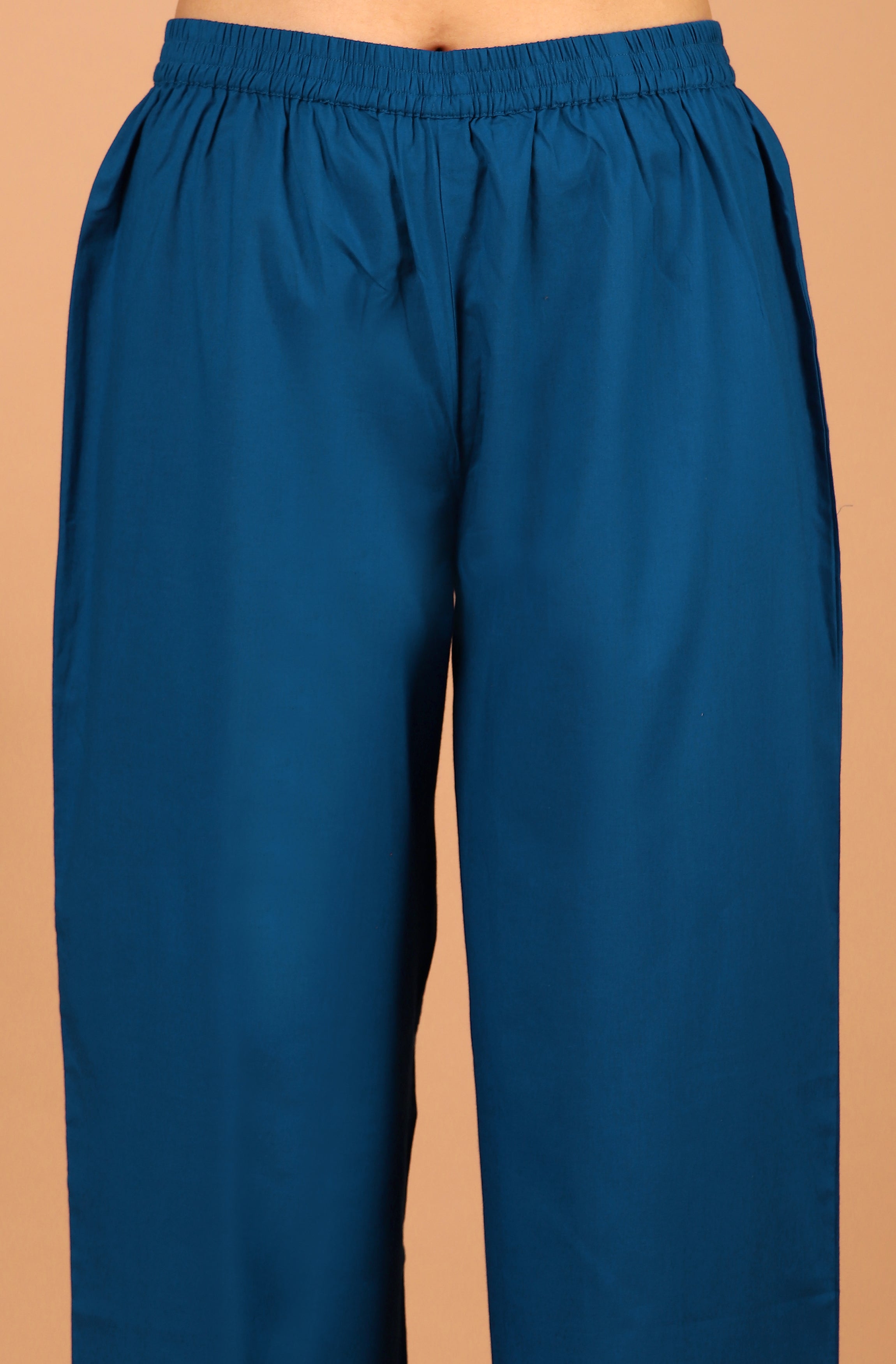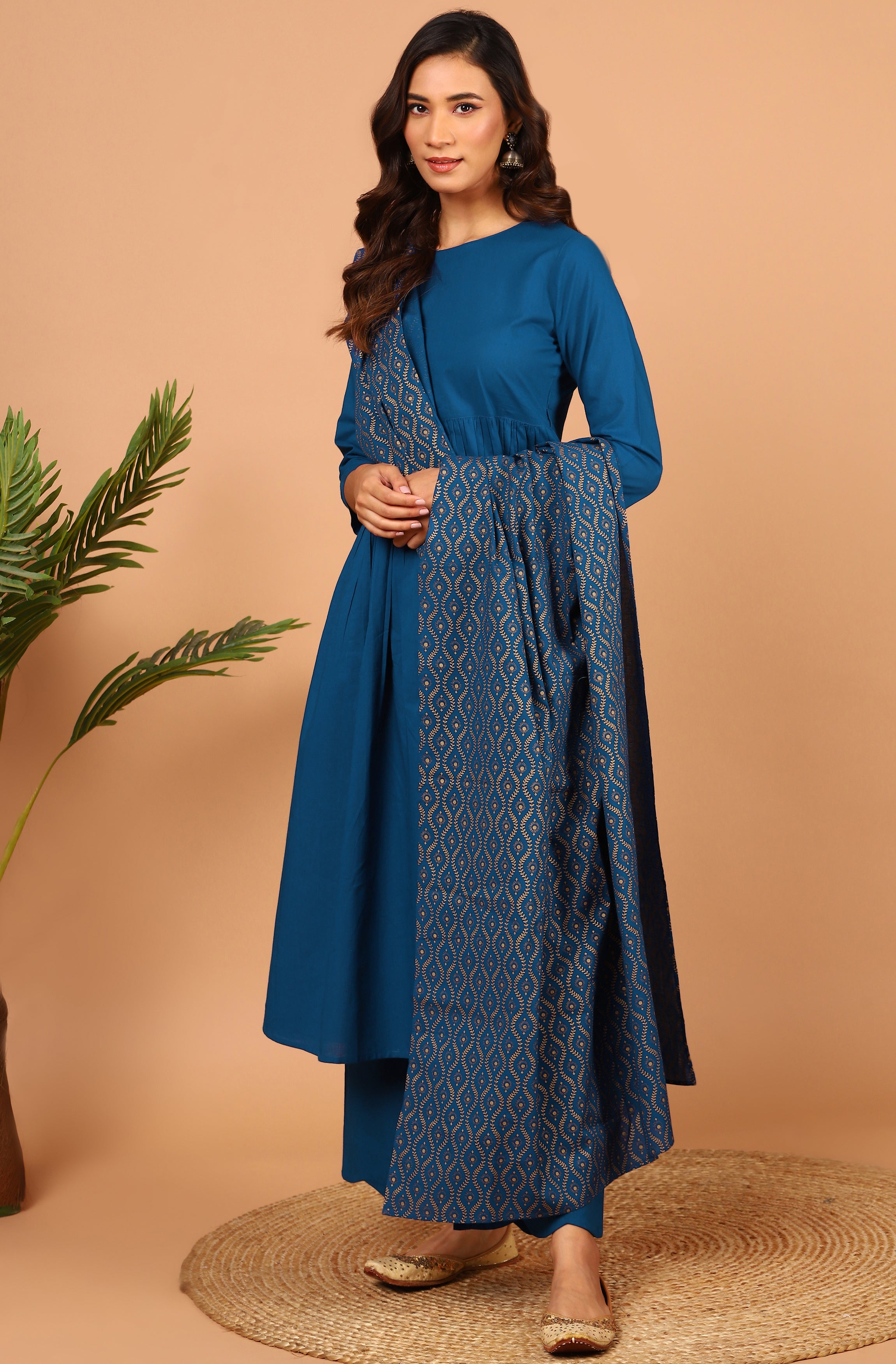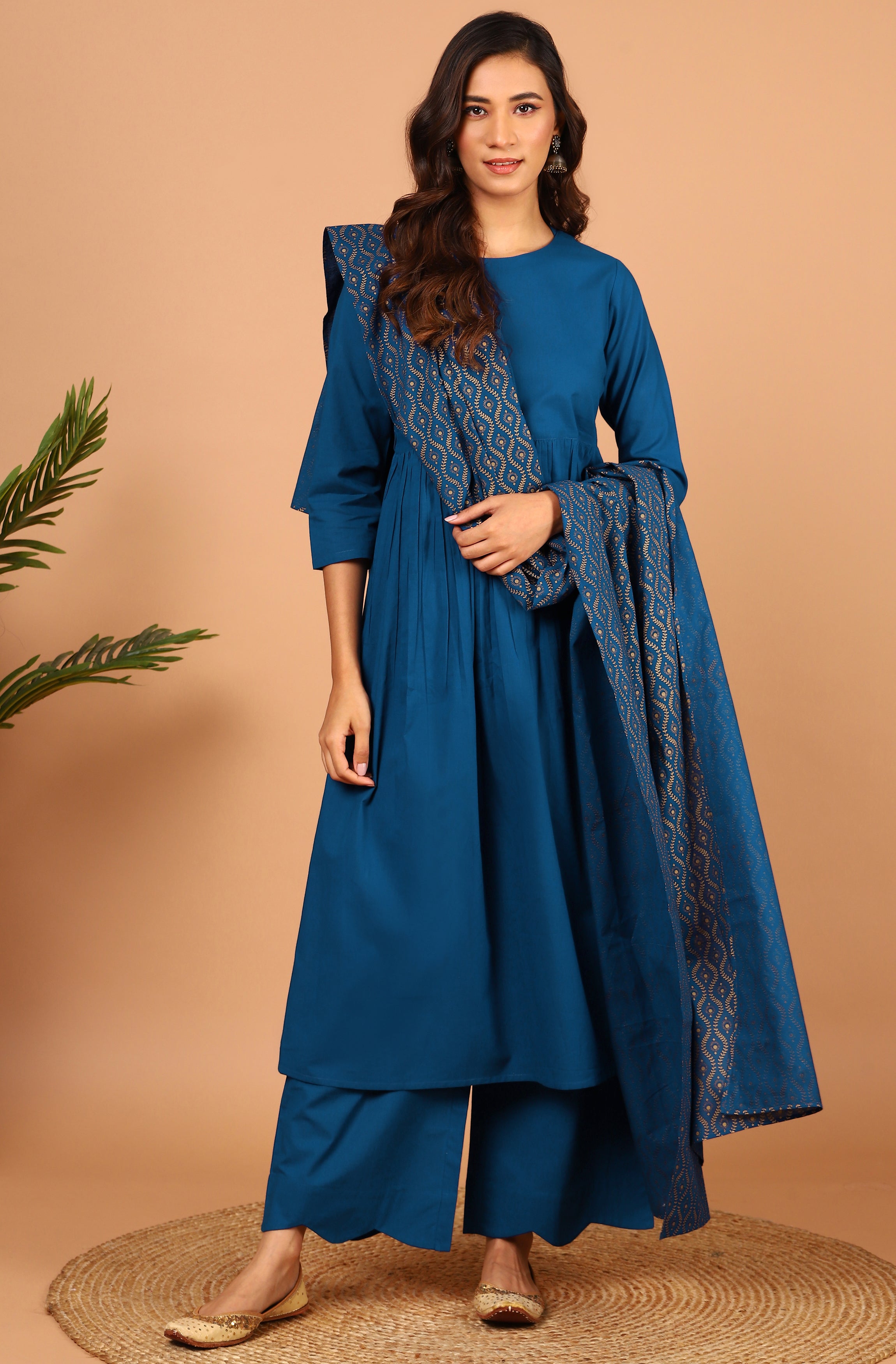 Be admired for your distinct sense of fashion by wearing this blue kurta palazzo set with dupatta from janasya. Constructed in a flared silhouette from a cotton material, this solid kurta and palazzo flaunts simplicity with printed dupatta for added charm. Pair it up with chandlier earrings and stilettos for festive look.