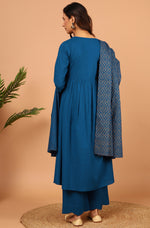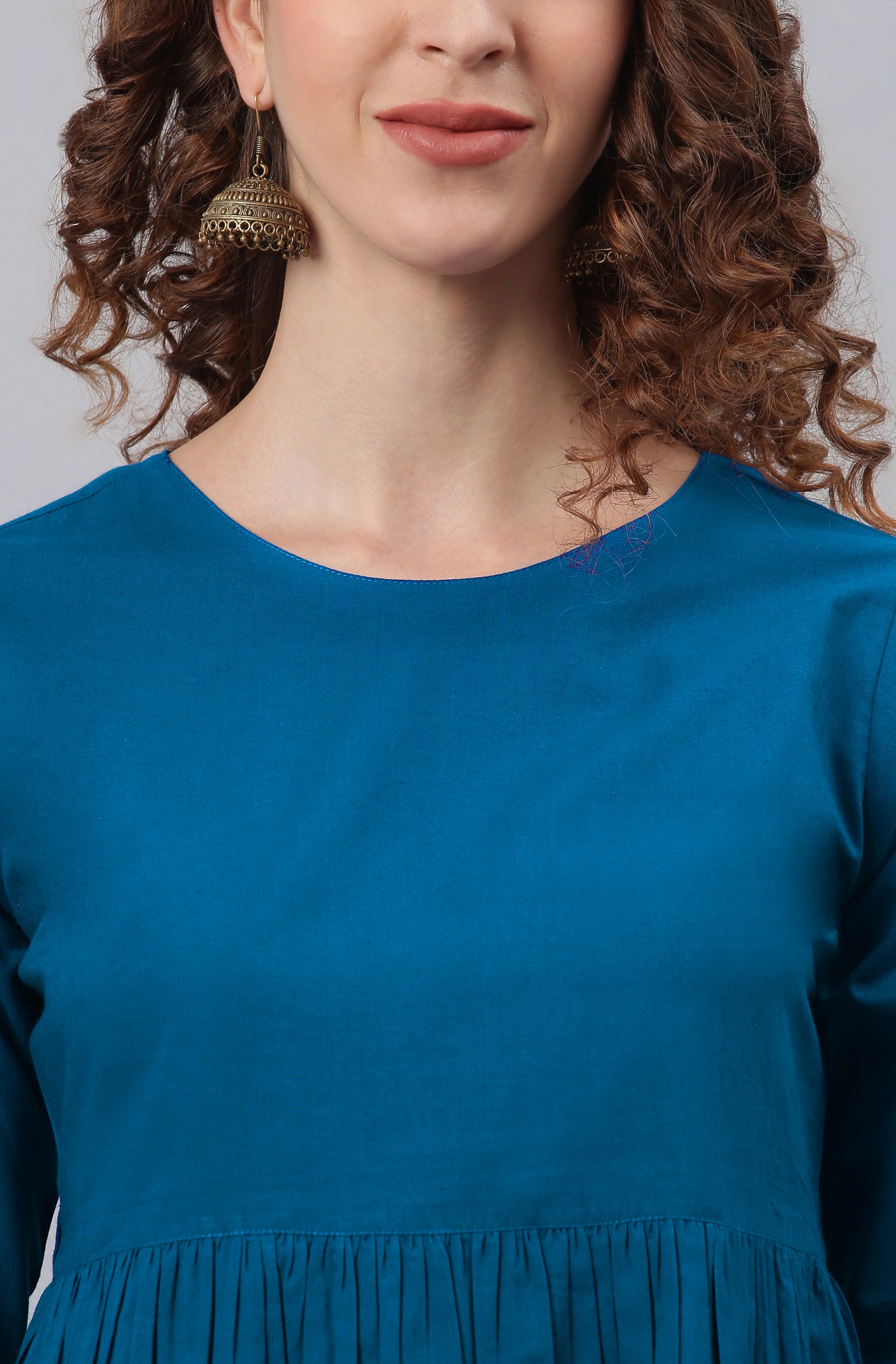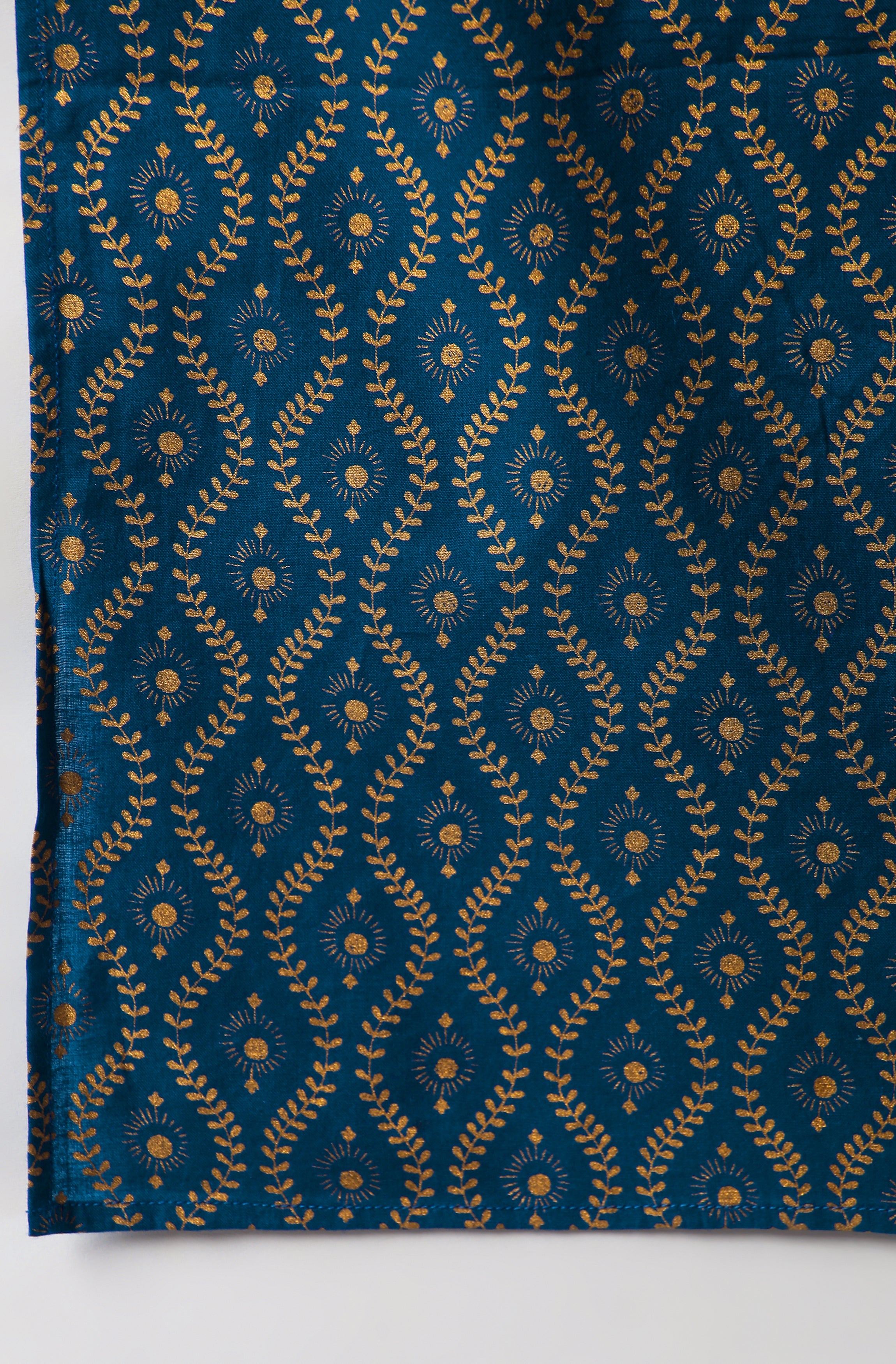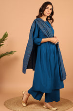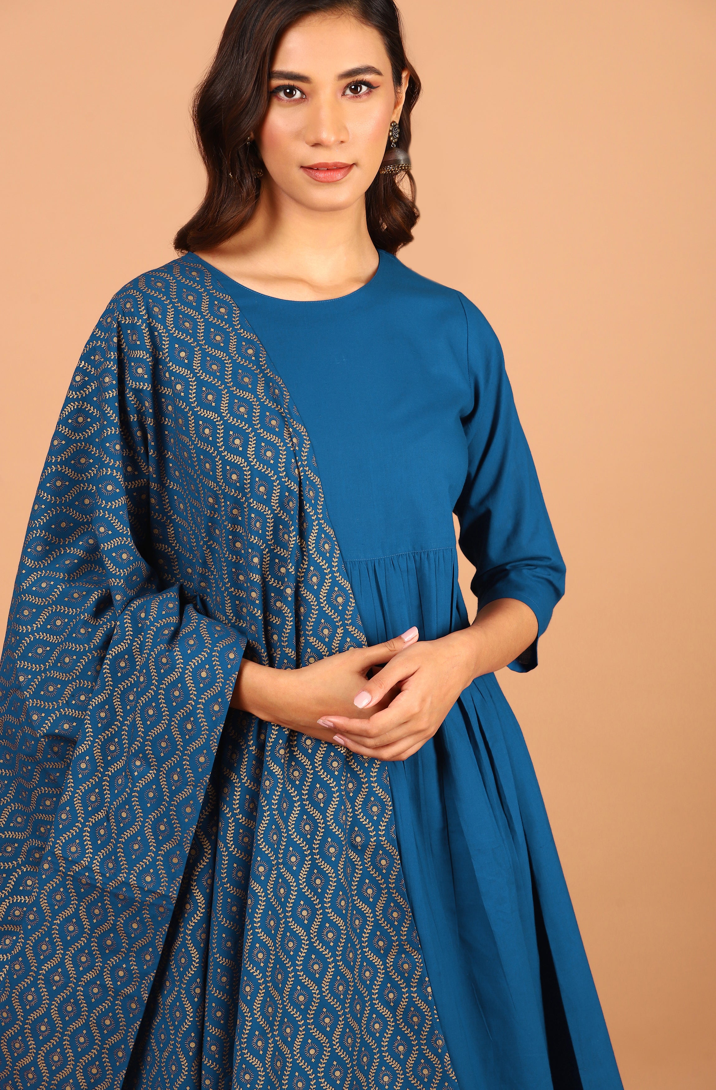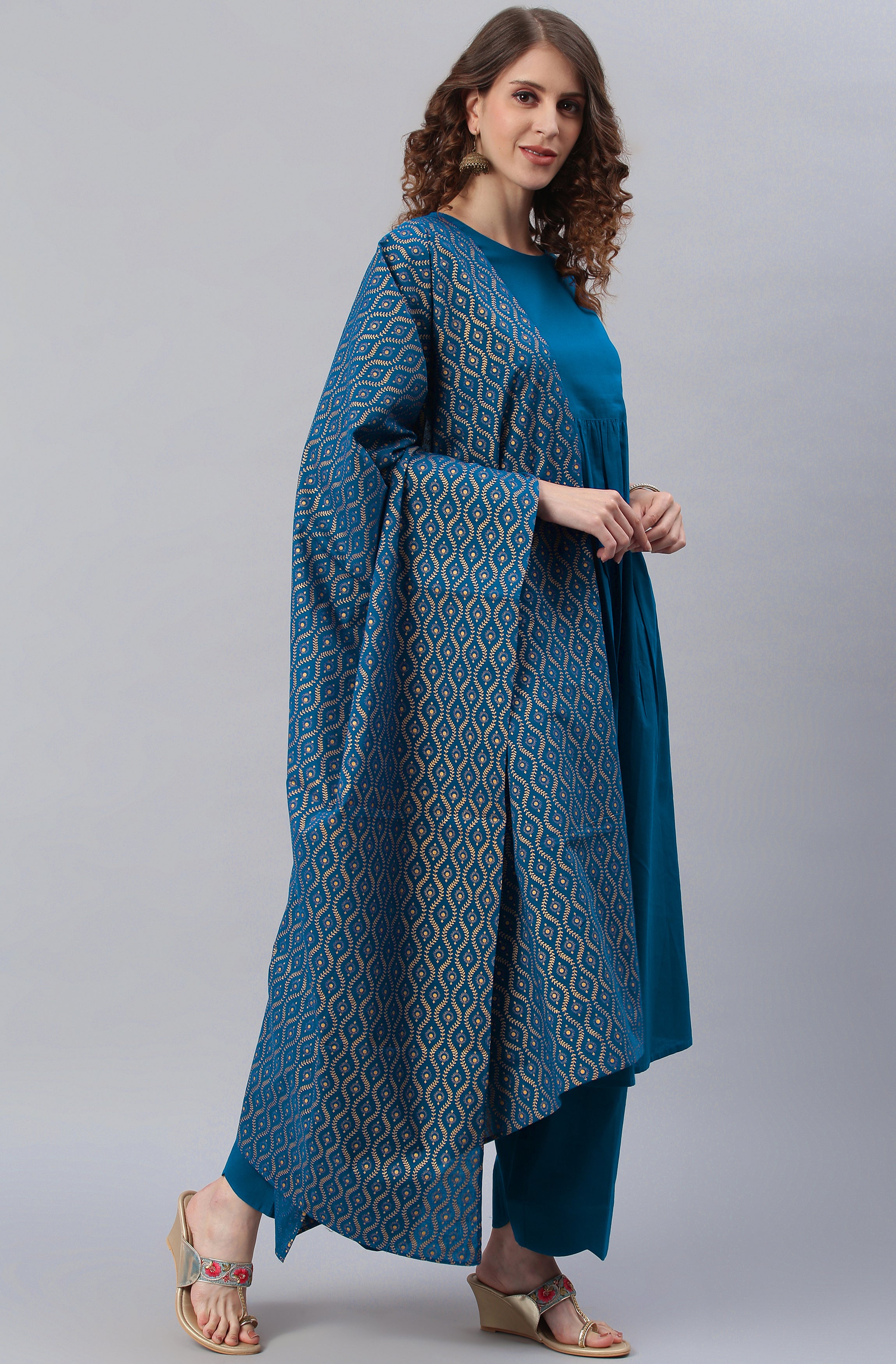 Be admired for your distinct sense of fashion by wearing this blue kurta palazzo set with dupatta from janasya. Constructed in a flared silhouette from a cotton material, this solid kurta and palazzo flaunts simplicity with printed dupatta for added charm. Pair it up with chandlier earrings and stilettos for festive look.