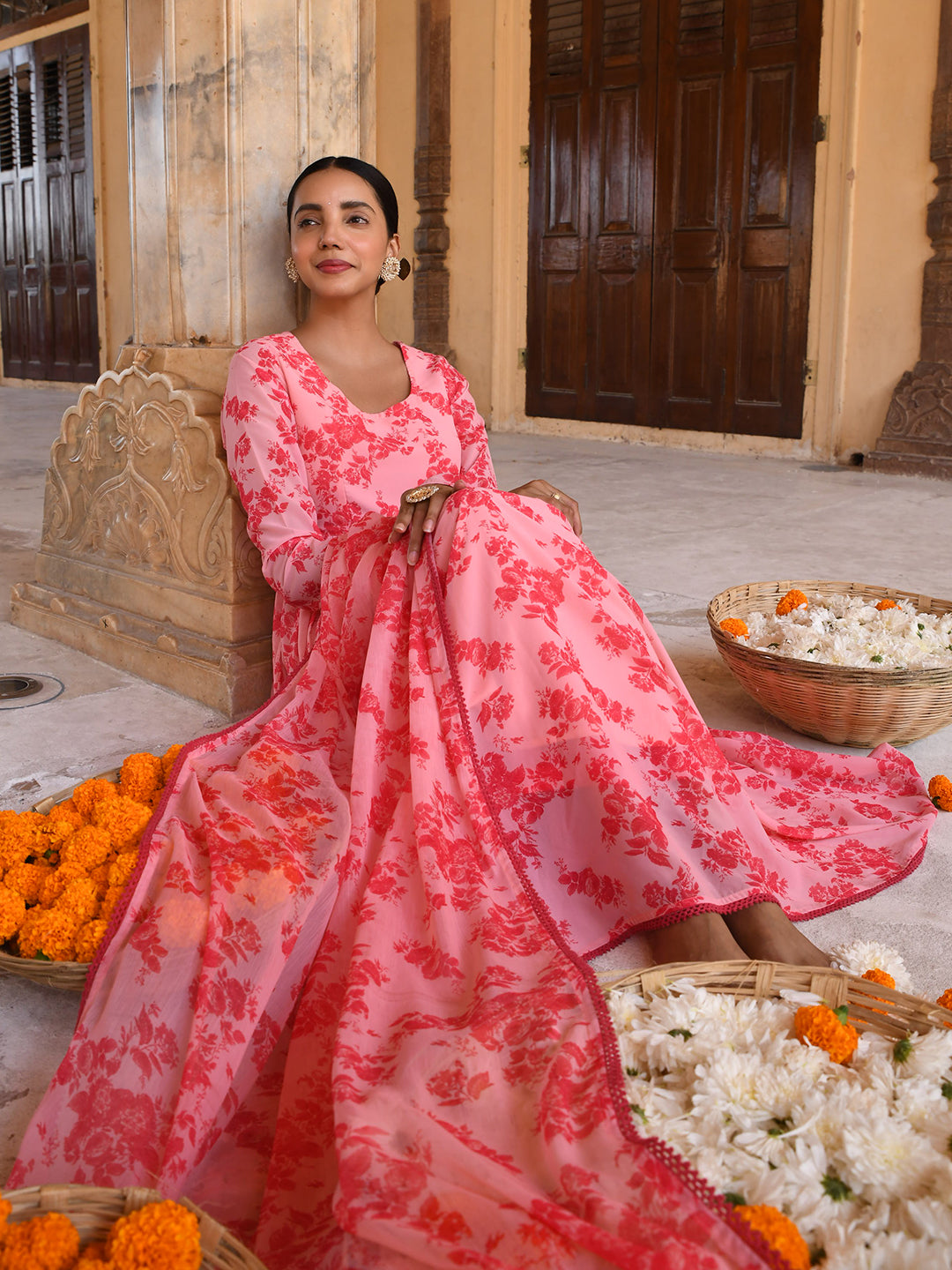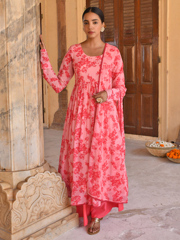 Opt for an everlasting, timeless look in this peach floral printed georgette kurta and palazzo set with printed dupatta. The kurta comes with all-over floral prints, round neck, full sleeves and lace detailing at the hemline. It comes with a solid pink flared palazzo and paired with the chiffon printed dupatta.