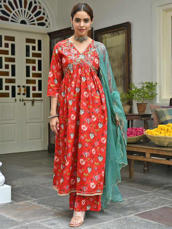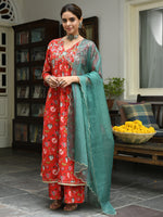 Liven up your regular day look with this red and green flared cotton printed kurta and palazzo set with organza dupatta. The kurta comes with all-over prints, 3/4 sleeves, v-neckline, flared silhouette with gota detailing. It comes with cotton palazzo featuring all-over prints, elasticated waist, paired with green organza dupatta with scallop detailing at the borders.