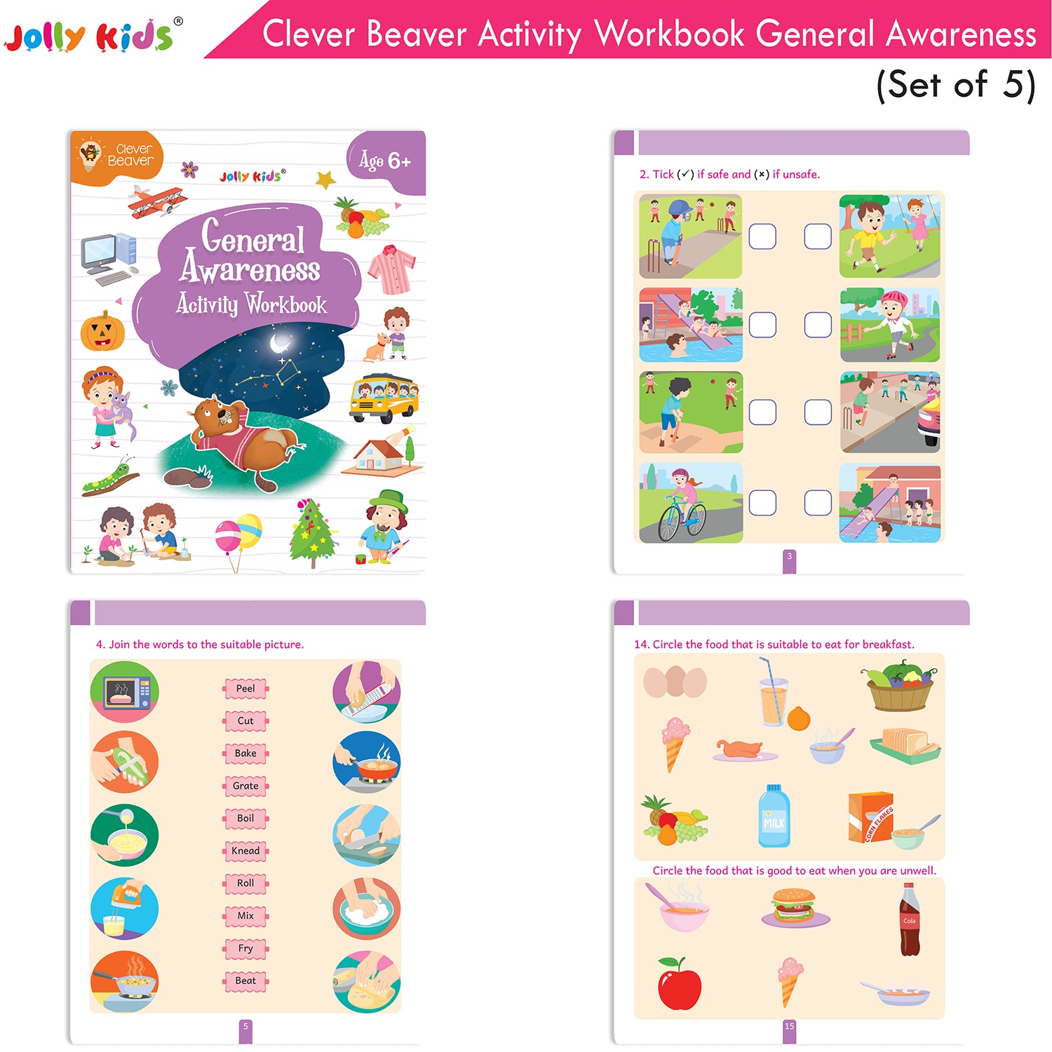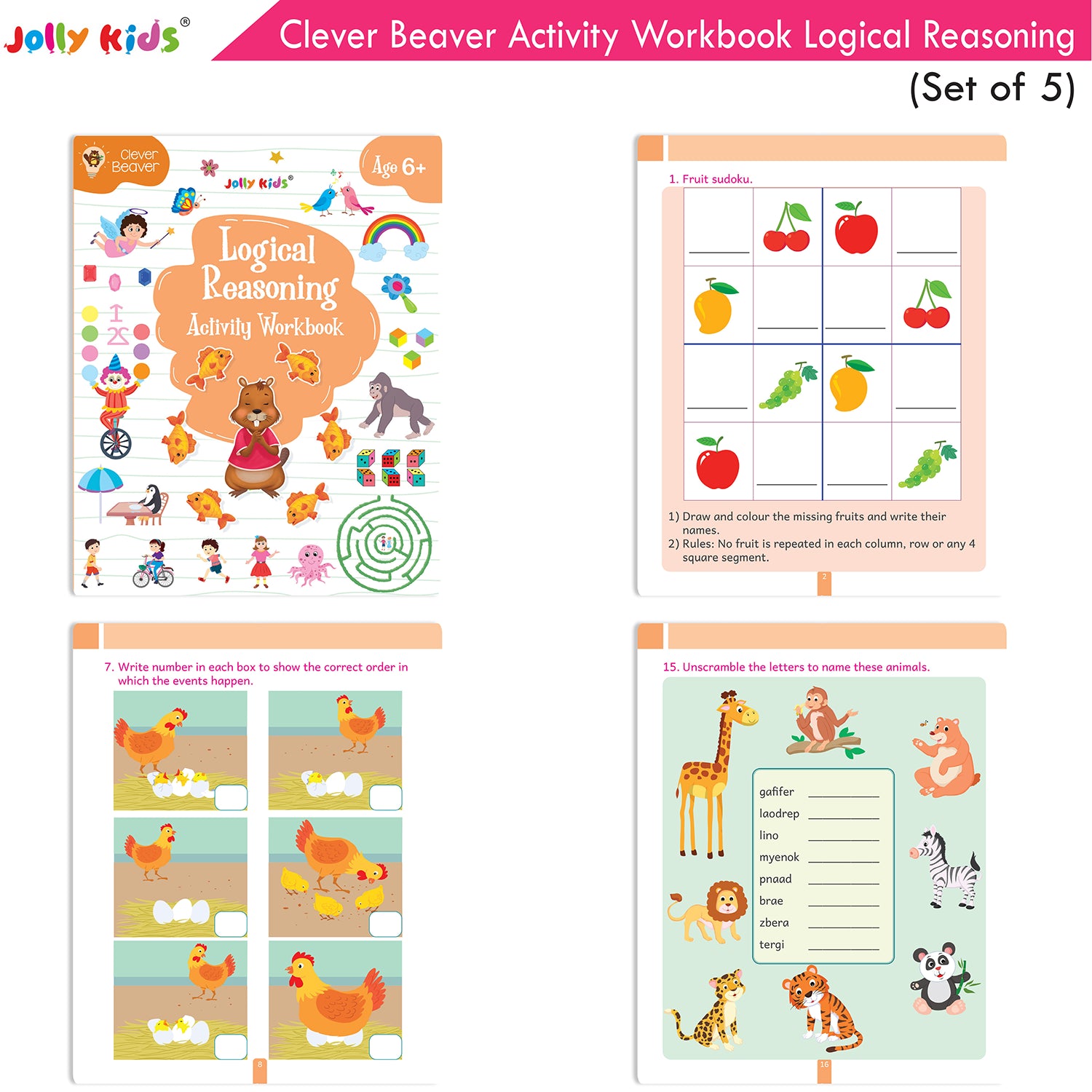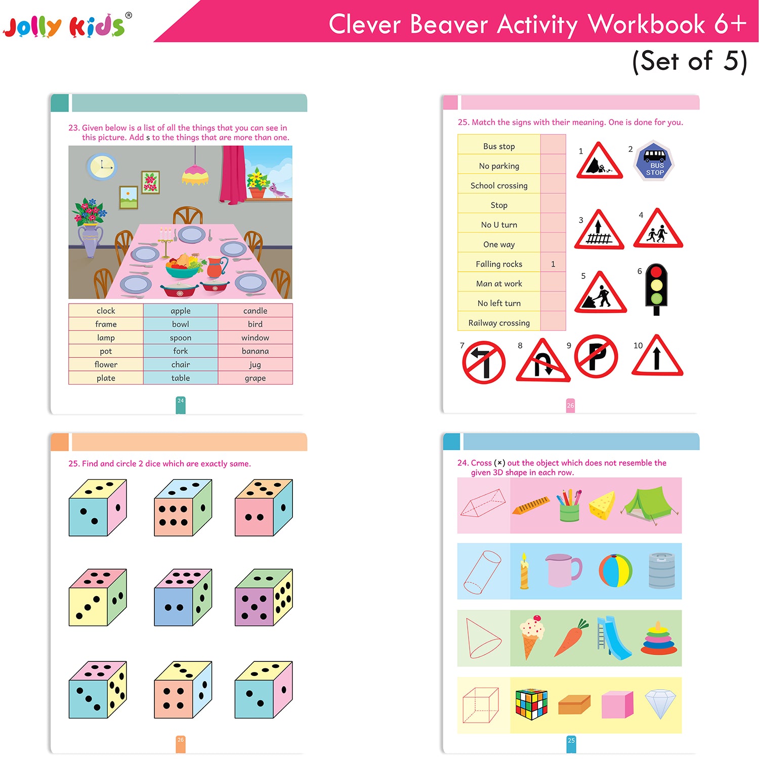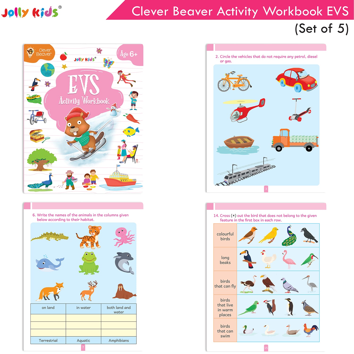 Jolly Kids Clever Beaver Activity Workbooks Set of 5 specially designed for children aged 6 and up. This engaging set covers essential skills in English, Environmental Studies (EVS), General Awareness, Logical Reasoning, and Maths, providing a fun and educational experience.