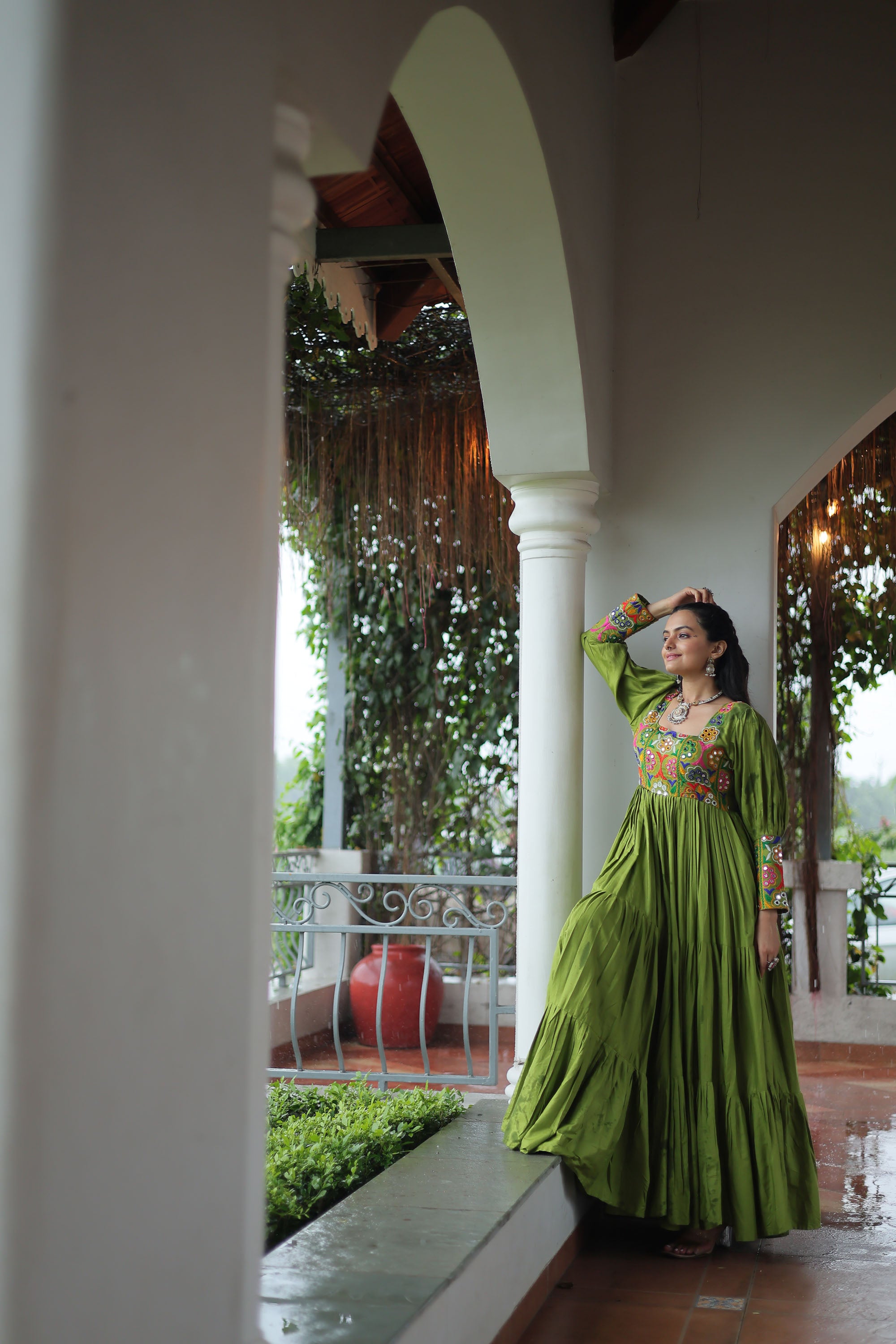 Lorenvalley Fashion Parotgreen Rayon with Kutchi Gamthi Work GownAbout the product:Navratri CollectionGown Fabric: - RayonGown Work: -  Kutchi Gamt...