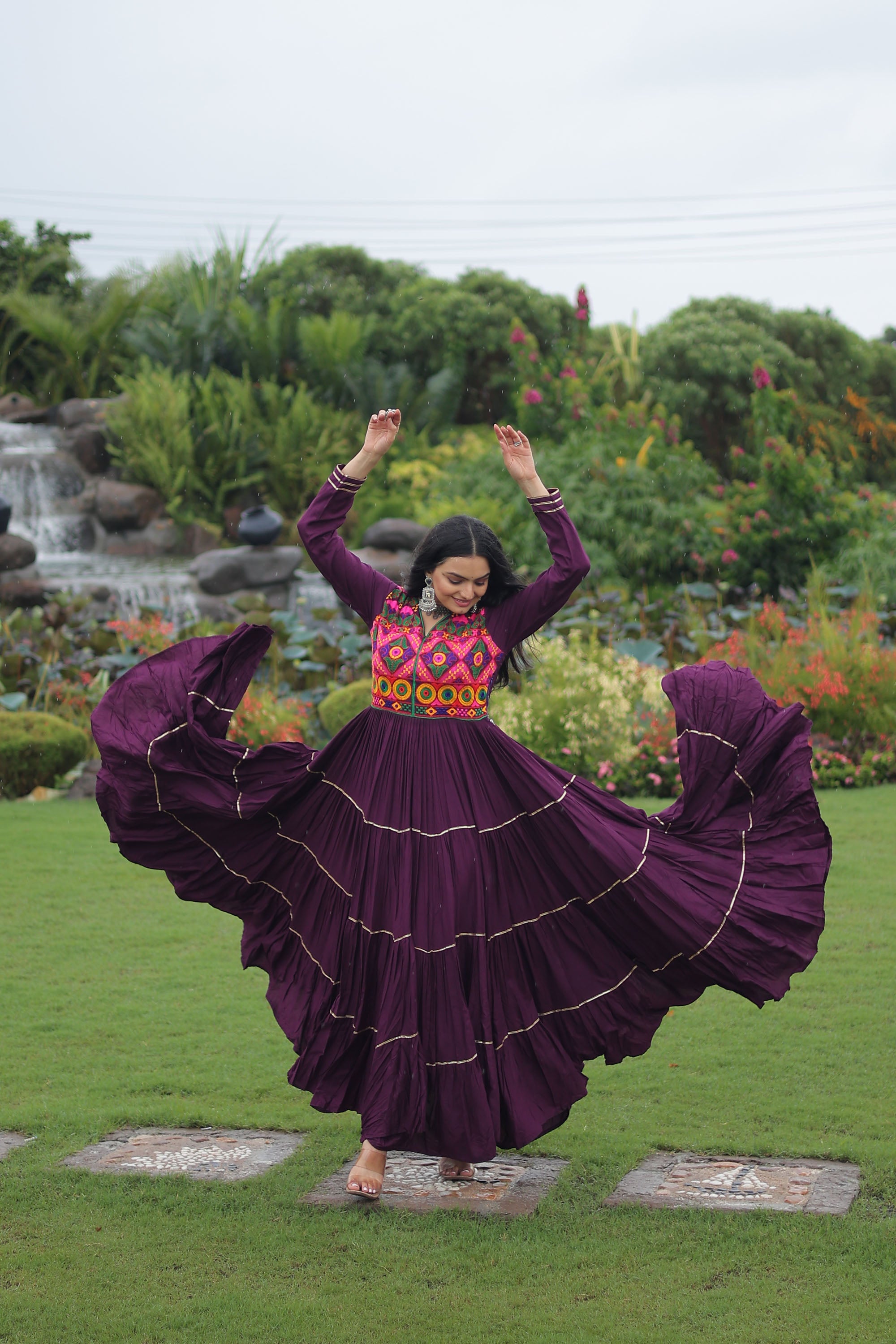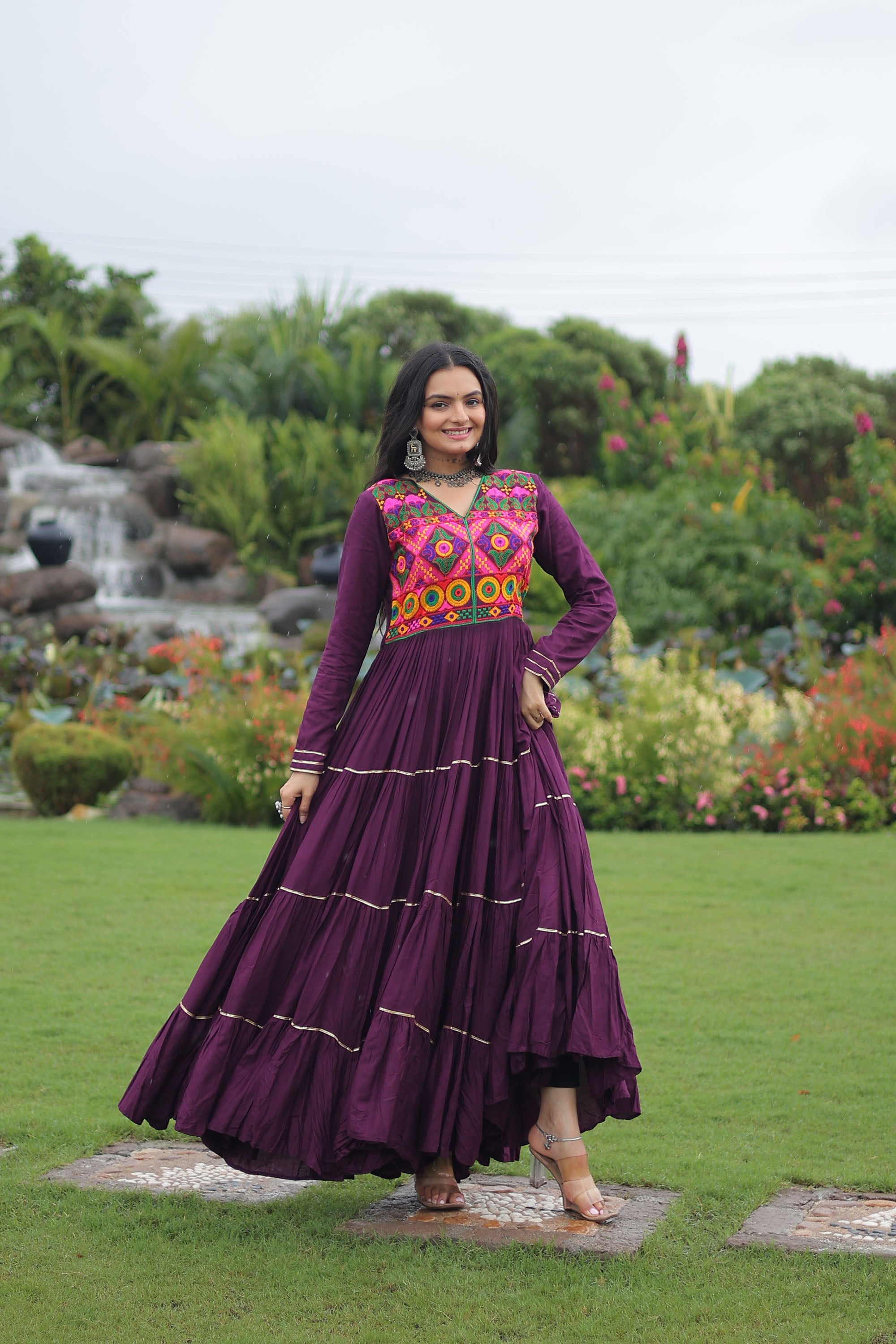 Lorenvalley Fashion Wine Rayon Kutchi Gamthi Embroidered & Mirror hand Work GownAbout the product:Navratri CollectionGown Fabric: - RayonGown W...