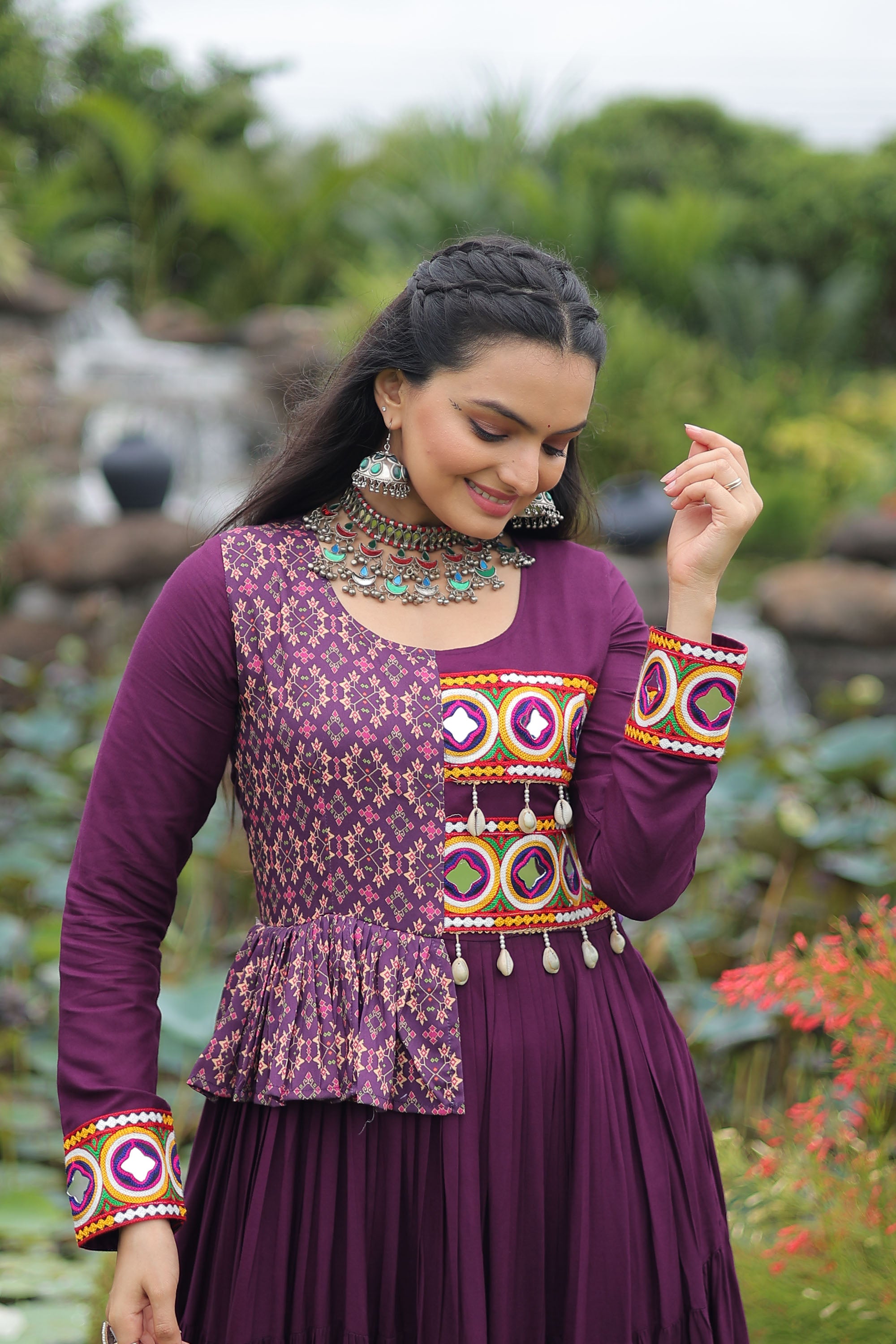 Lorenvalley Fashion Wine Rayon Kutchi Gamthi Embroidered Work & Cotton Print Work GownAbout the product: Navratri CollectionGown Fabric: - Rayo...