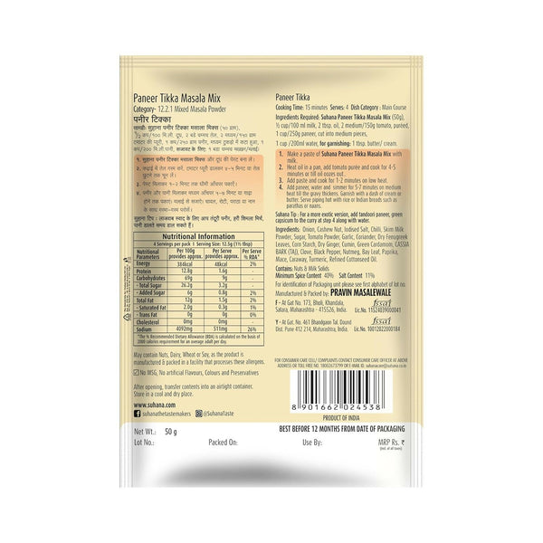 Suhana Paneer Tikka Masala Mix is a ready-to-use blend of spices designed for making North Indian-style paneer dishes at home. The mix combines aromatic ingredients such as fenugreek, cinnamon, and cashew nuts, along with a variety of traditional spices. This mix provides a convenient solution for preparing flavorful paneer and vegetable dishes.