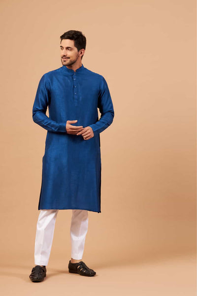 Blue Plain Kurta by Hilo DesignThis blue kurta is made of falling raw silk, giving it a luxurious and soft feel. The lightweight fabric is perfect ...