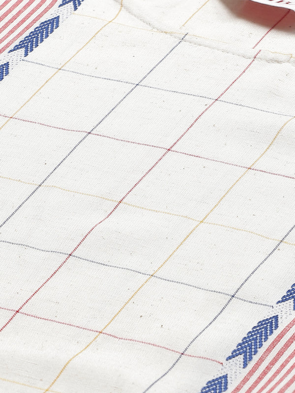 Off-White and blue checked A-line knee length kurta with embroidered detail, has a round neck, short sleeves, asymmetric hem