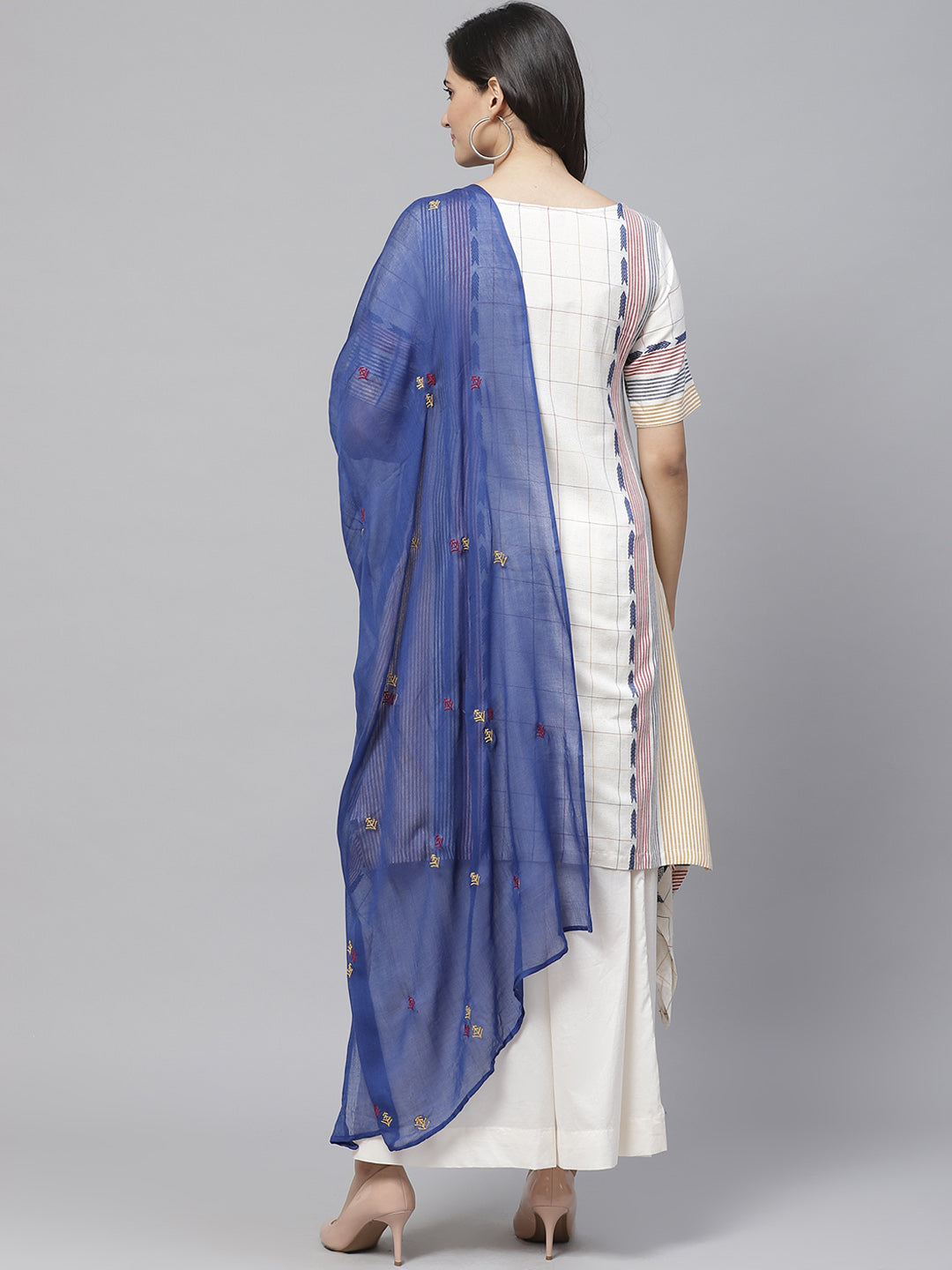 Biba Women Off-White & Blue Checked Asymmetric Kurta with Palazzos & Dupatta
